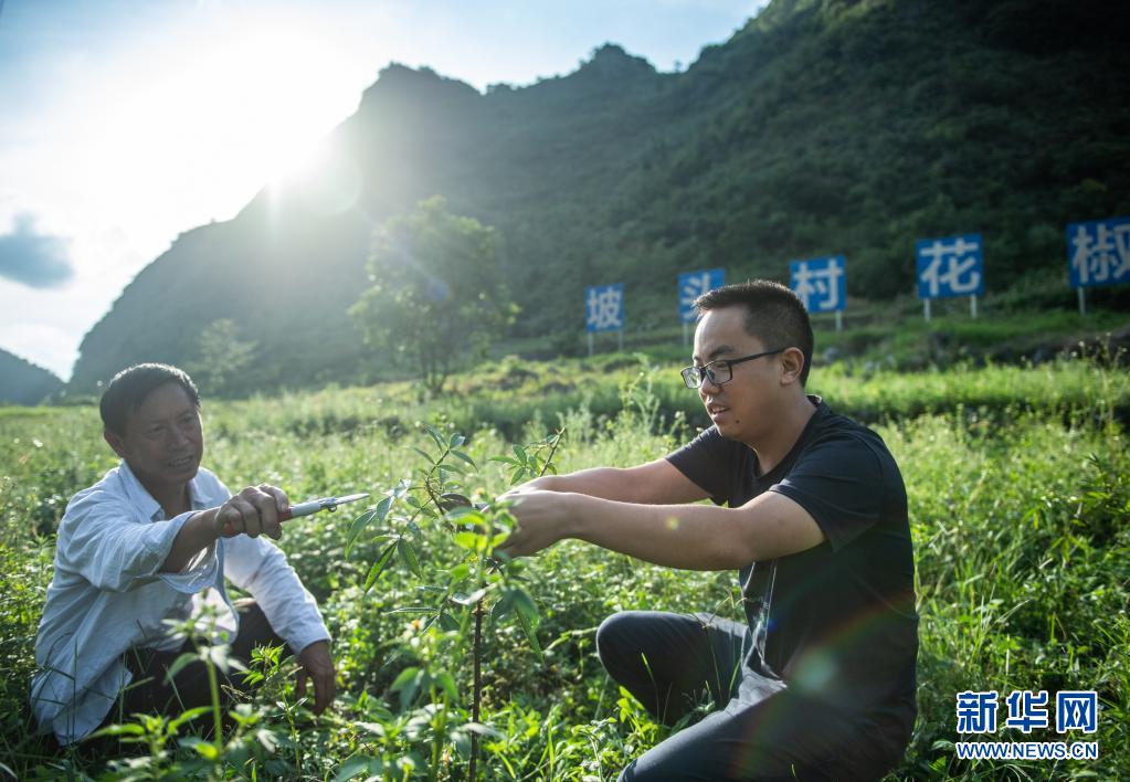 贵州省望谟县乐旺镇党委第一书记张航(右)在农技员岑连刚的指导下给花椒苗修枝(2020年9月15日摄)。新华社记者 陶亮 摄