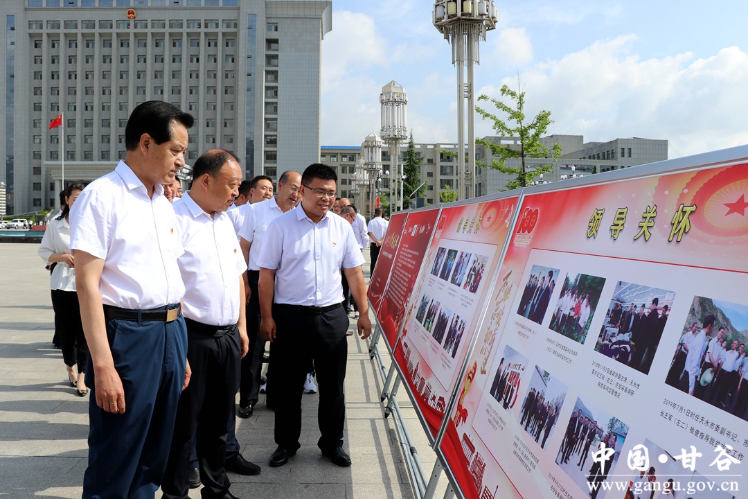 新天水讯 据甘谷县融媒体中心消息 7月1日,天水市人大常委会副主任、甘谷县委书记申君明,县委副书记、县长吴健,县政协主席马骥等县四大组织领导在冀城广场参观庆祝中国共产党成立100周年成就展。