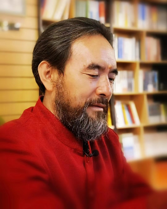 在天一书店见到国家一级作家、甘肃省作协副主席、文化学者雪漠时,他的形象与记者在查资料时看到的并无不同,略微卷曲的头发、浓眉、络腮胡、鲜艳耀眼的红衣,颇有几份“胡人”的粗犷之气。