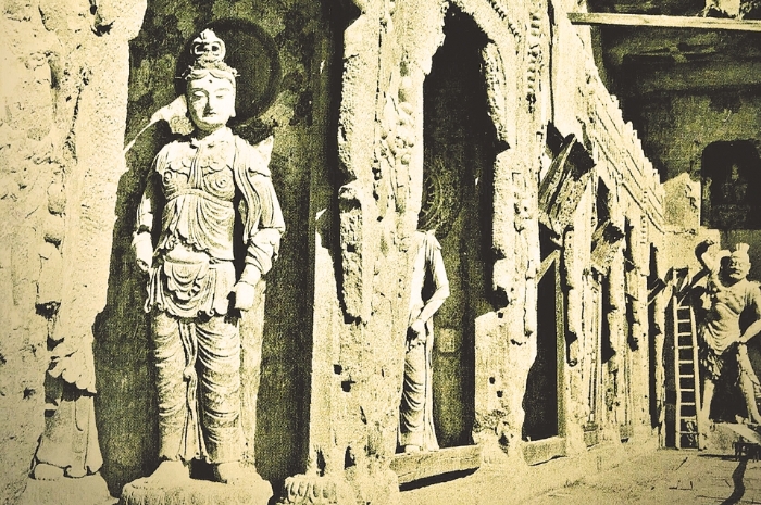 “早期的麦积山石窟外观全部是木质栈道,自1977年开始,麦积山石窟进行了大规模山体加固工程,之前的木质栈道已基本拆完,可惜当时没有留下太多影像资料。从庐江草堂所藏第43窟的照片中,洞窟外景的老栈道上,基本可以反映出当时麦积山石窟栈道的木结构工艺。而东崖大佛这张照片,佛像脸部的严重破损,恰好反映了未修复前佛像原来破损时的状态,也正好弥补了我们加固工程后没有留下之前影像记录的遗憾。”麦积山石窟艺术研究所数字中心负责人董广强介绍说。