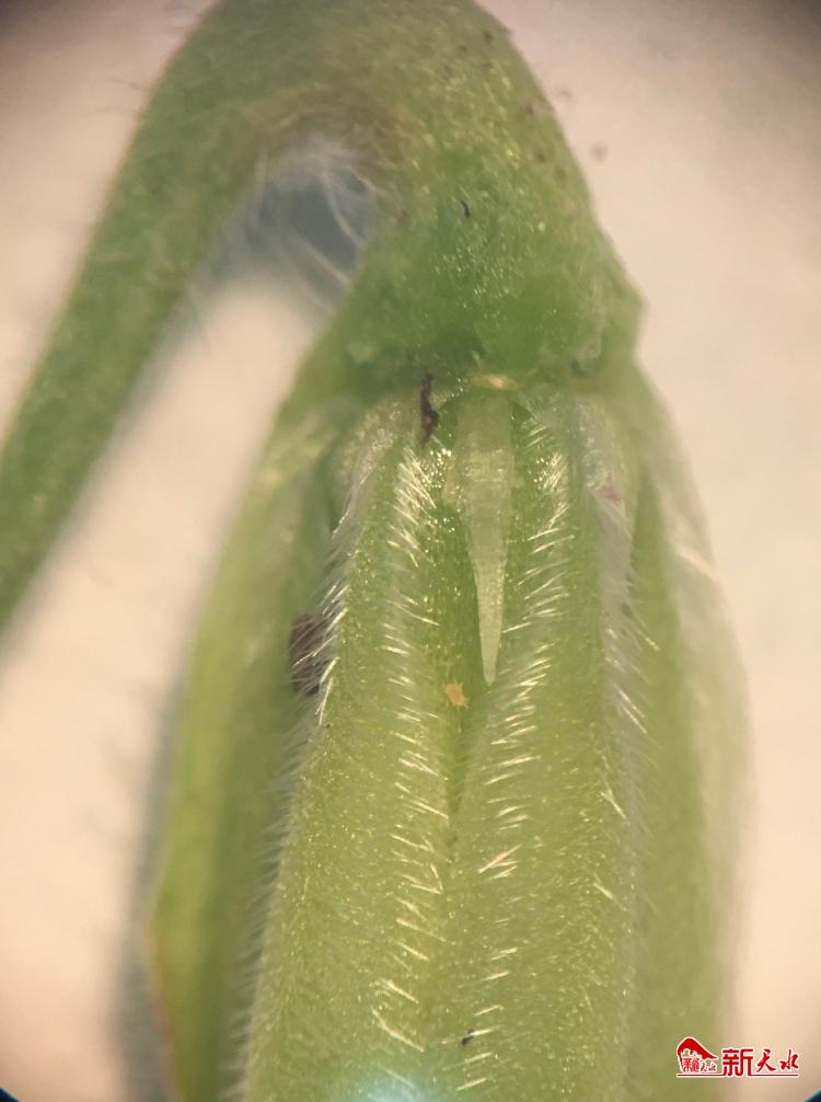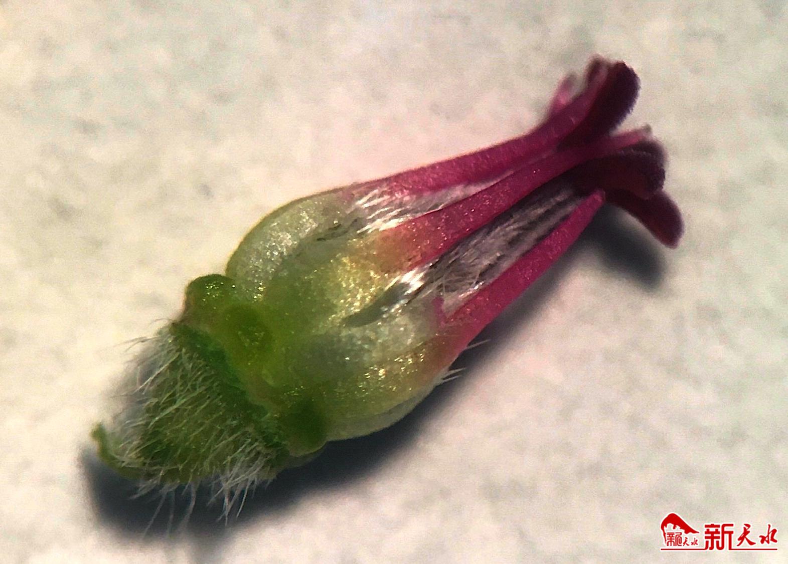 外轮雄蕊退化得比较彻底,大概只有1-2mm长,透明色,在蒴果的脊上贴着蒴果的粗糙毛长,尖端有一点点粉色或无,若不细看,几乎发现不了它的存在。既已解密,那咱们就解剖镜下见。