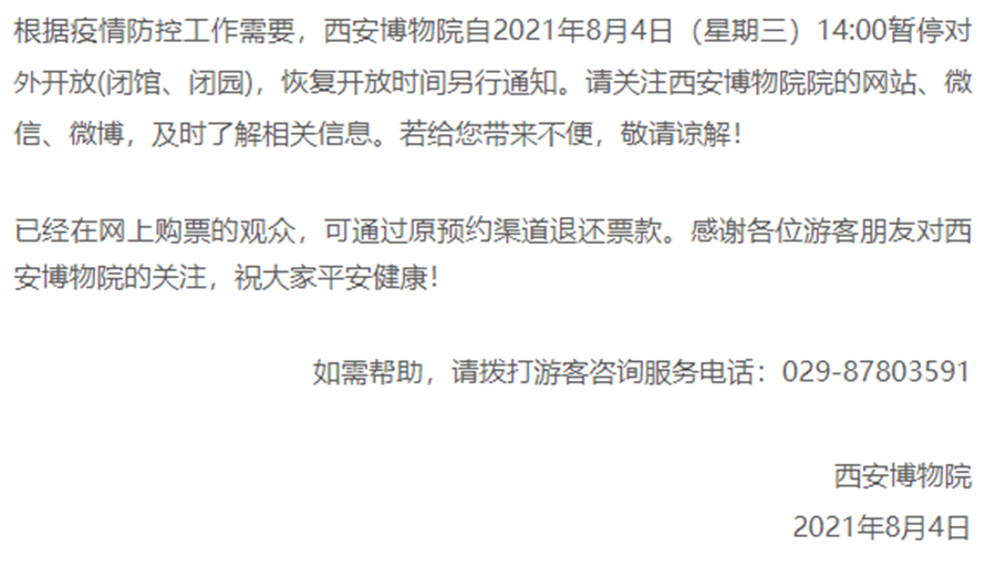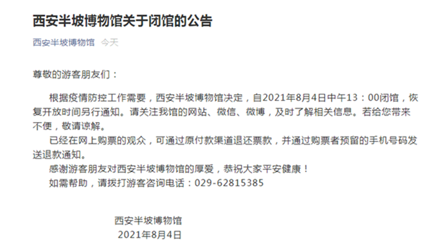7.西安半坡博物馆8月4日13:00起暂停开放,恢复开放时间另行通知。