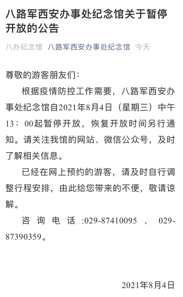 6.八路军西安办事处纪念馆8月4日13:00起暂停开放,恢复开放时间另行通知。