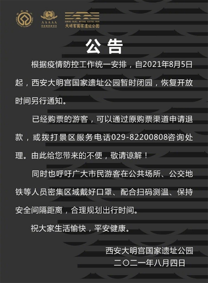 4.大明宫国家遗址公园8月5日起暂时闭园,恢复开放时间另行通知。