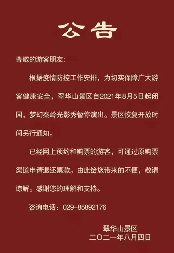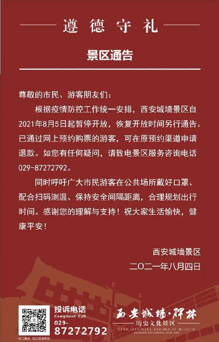 2.根据疫情防控工作统一安排,西安城墙景区自2021年8月5日起暂停开放,恢复开放时间另行通告。