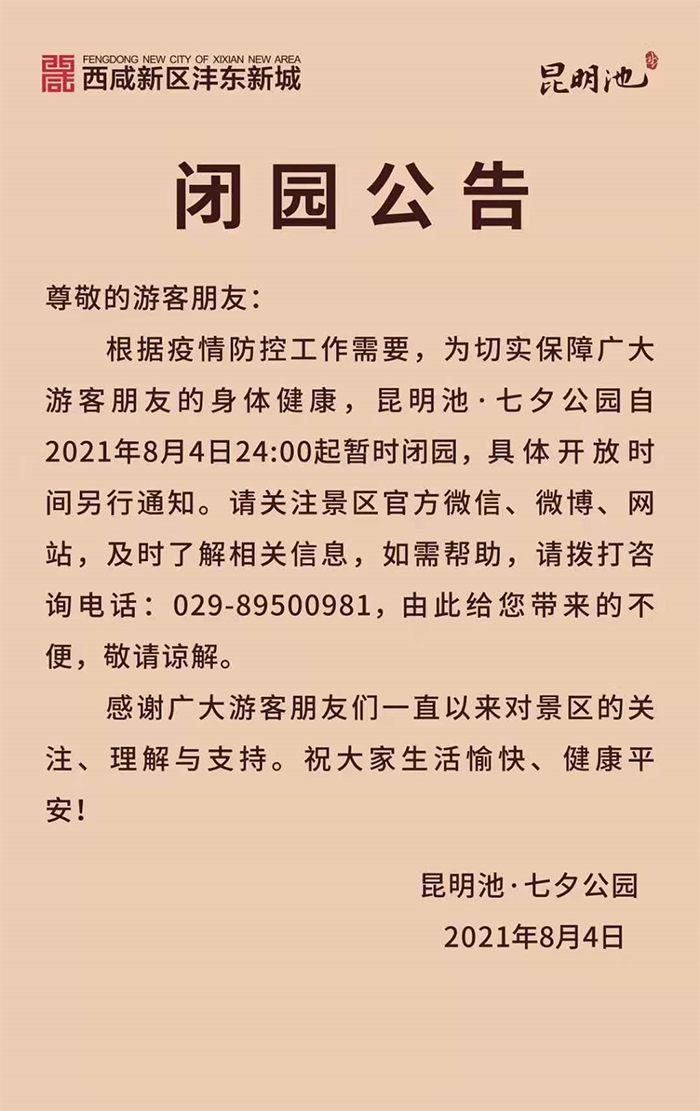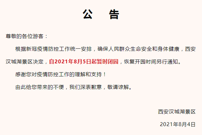 5.西安汉城湖景区8月5日起暂时闭园,恢复开园时间另行通知。