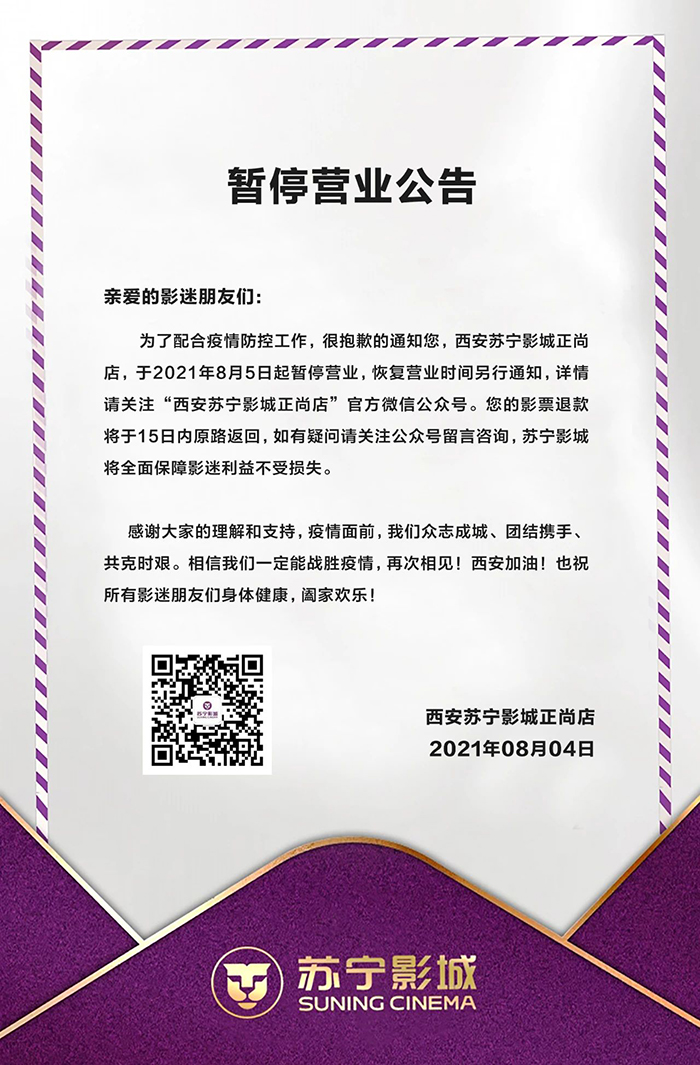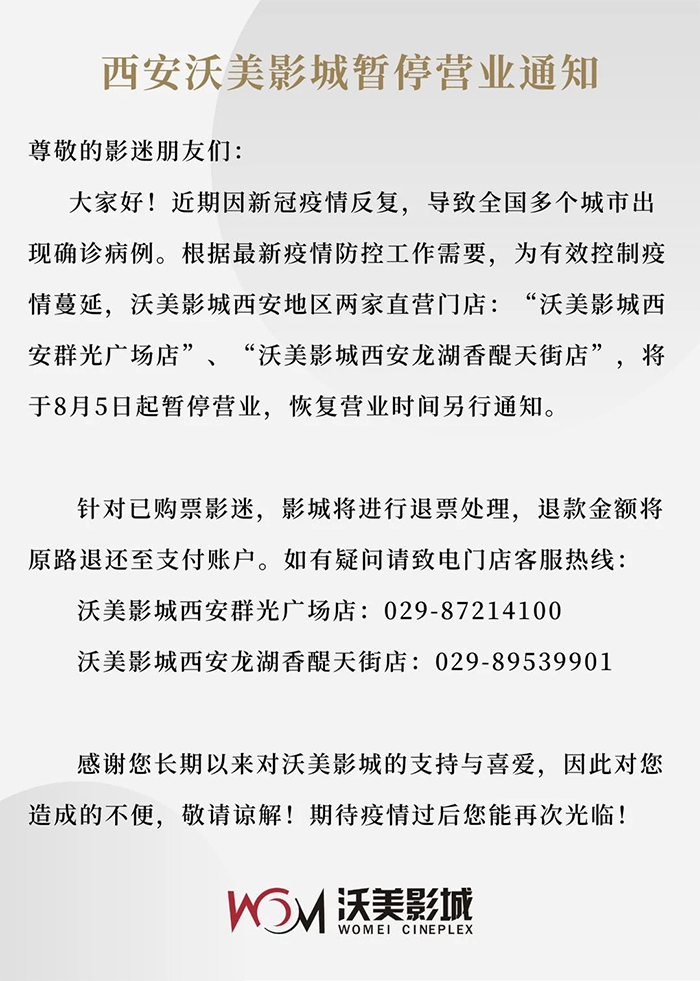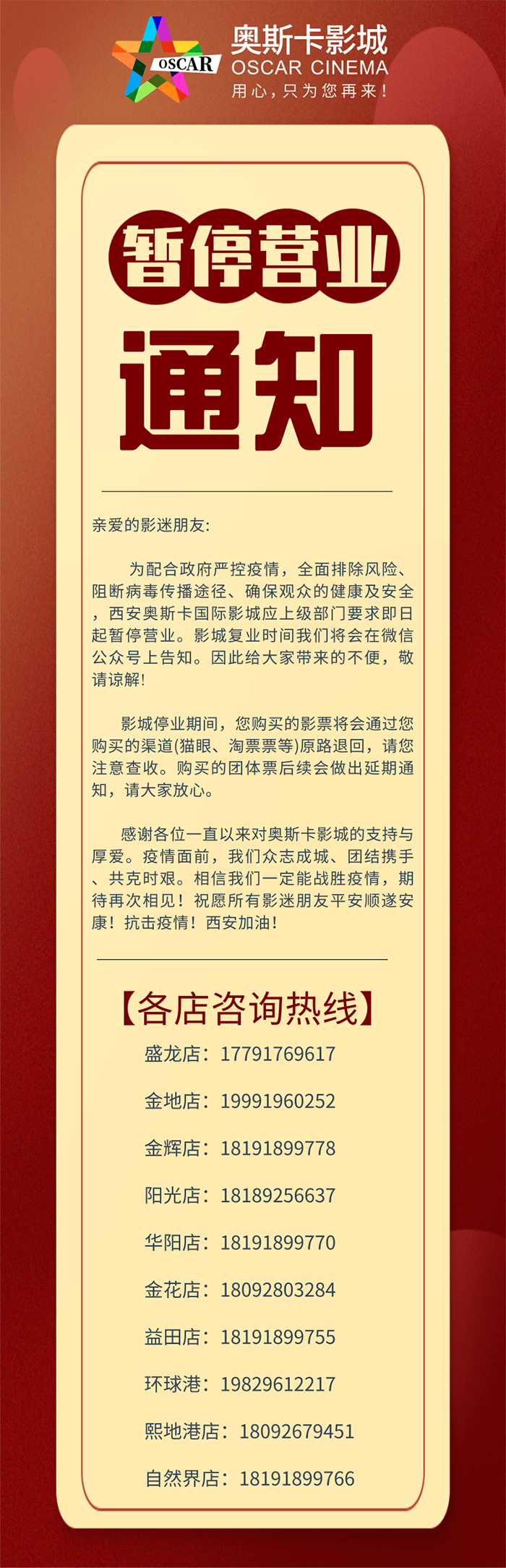 为了积极配合新型冠状病毒疫情防控工作,保障影迷和员工的健康与安全,西安所有影城即日起暂停营业。具体恢复营业时间,将参考疫情发展及国家相关规定,详情以公告为准。