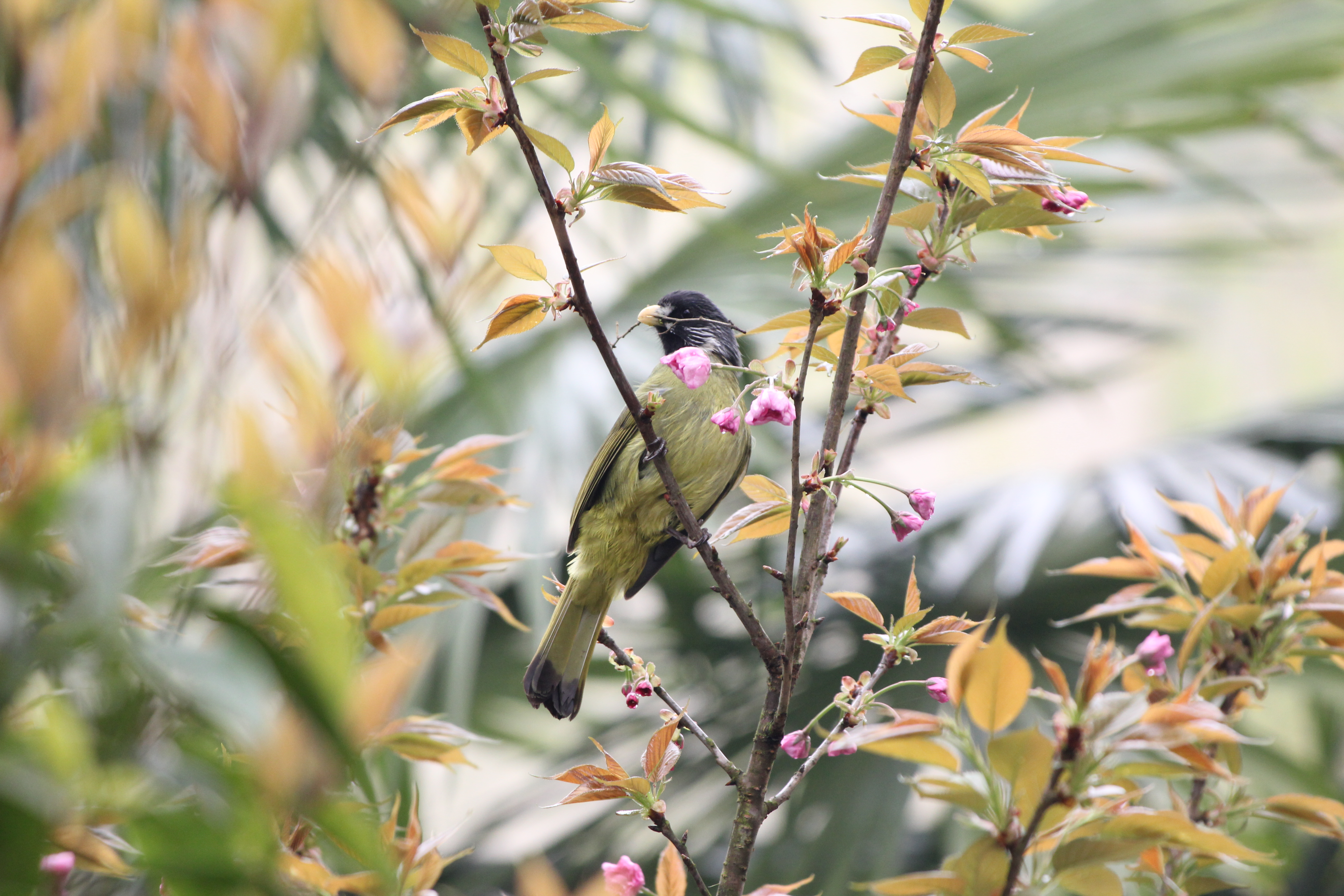 领雀嘴鹎的食谱里排列着一系列的花朵和果子,是典型的花果爱好者,因这缘故,我阳台外的那几棵红叶李树也就成了领雀嘴鹎的餐厅,开花的时候飞过来吃花,果子熟了飞过来吃果子,来的次数多了,对我这个邻居也不见外,没有丝毫惧怕的意思,大大方方地享用眼前的美味,吃饱了,就地唱一会儿曲子,像是对红叶李树殷勤招待的赞美。