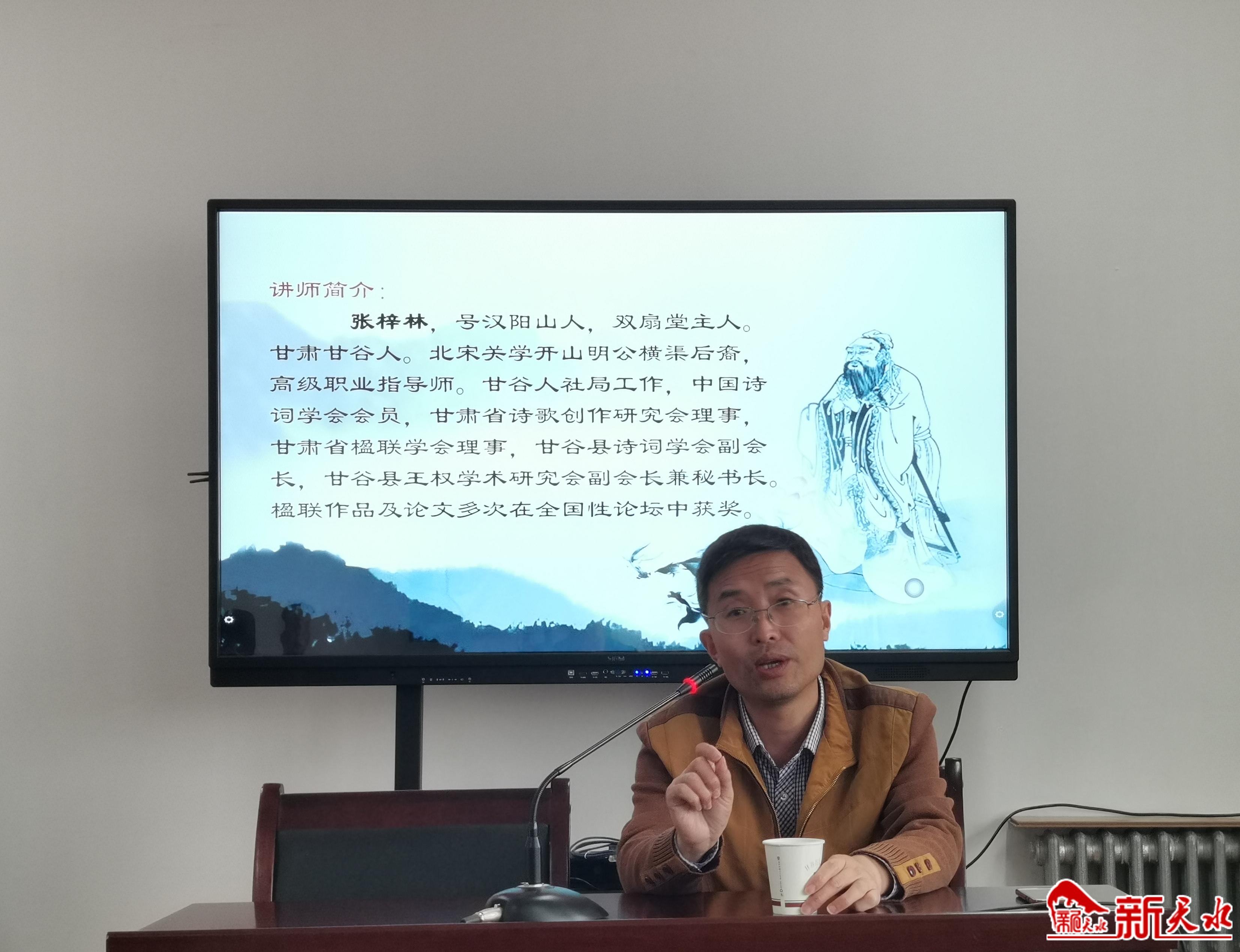 新天水讯【记者 刘蕾】为了弘扬中华民族优秀传统文化,培育和践行社会主义核心价值观,充分发挥图书馆的公共文化阵地作用,在一年一度的中秋节来临之际,9月14日下午,由甘谷县文旅局主办、县图书馆承办的“月满庆团圆 中秋话先贤”主题讲座在县图书馆多媒体室举行。讲座邀请了甘谷县文化学者张梓林老师主讲,共有20余名读者聆听了此次讲座。