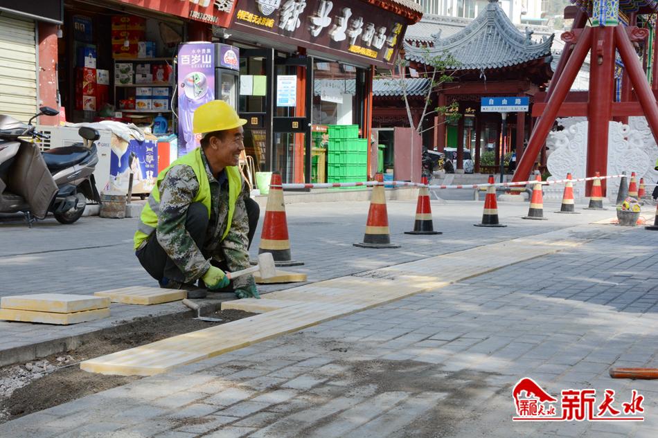 50多岁的冯岁呆在秦州区藉河北路人行道修补工地上已经干了七八天的活,主要工作就是砌砖。“路南面的人行道以前没有铺盲道,这次施工在原有人行道的基础上铺设了盲道,方便盲人出行,这样的城市才有温度。”