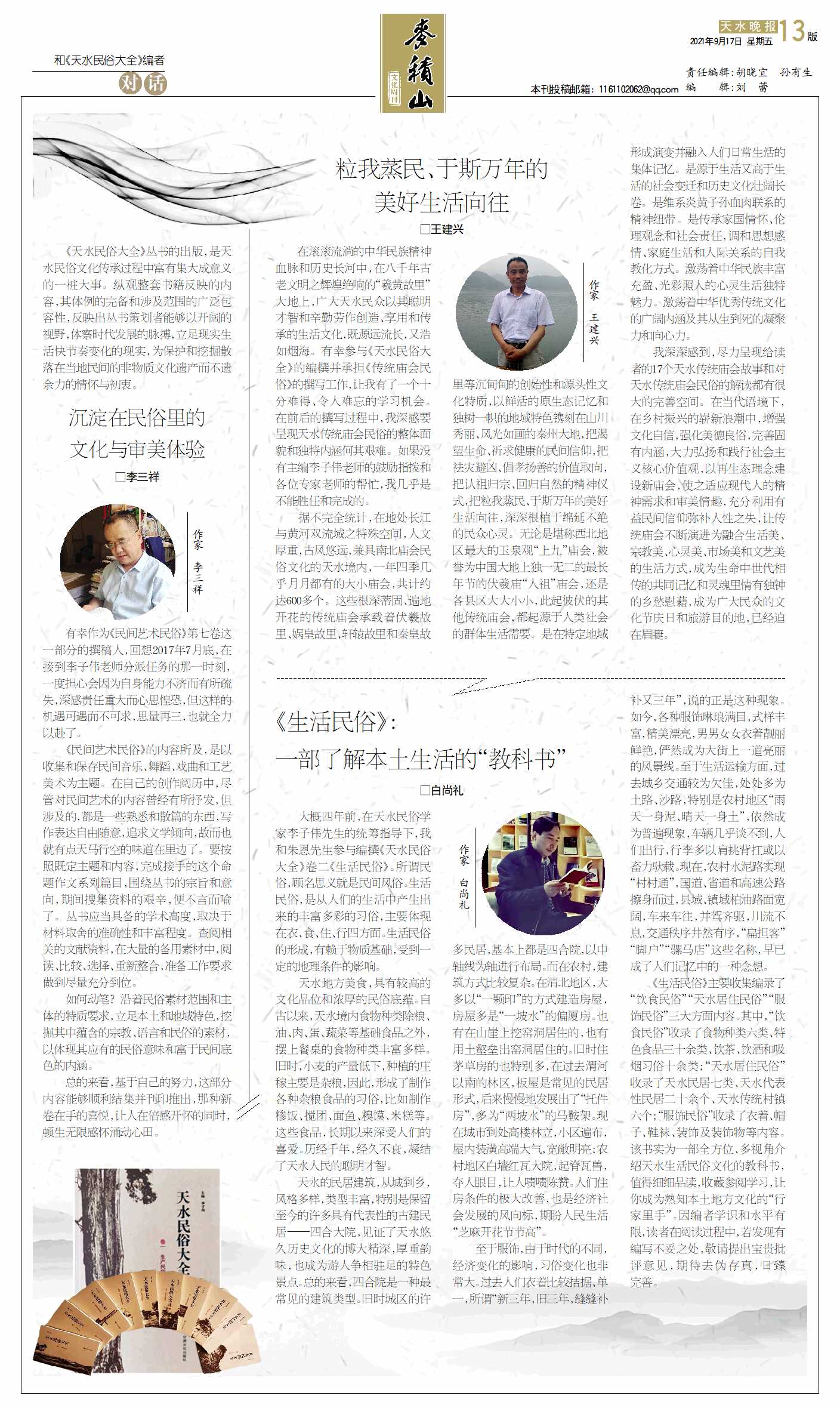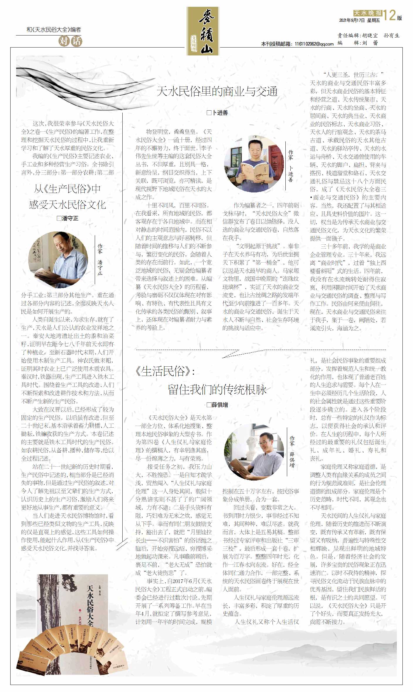 这次,我很荣幸参与《天水民俗大全》之卷一《生产民俗》的编著工作,在整理和挖掘天水民俗的过程中,让我重新学习和了解了天水厚重的民俗文化。