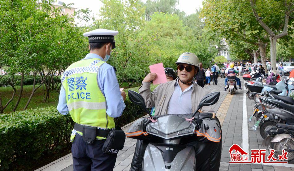 9月18日中午放学时间,在公园小学门口,城区交警大队一中队辅警王伟正在为骑电动车接孩子的家长发放规范停车宣传单。“希望广大的市民朋友,出行要按照规定停放车辆,一方面为创城出力,一方面为他人提供方便,我们也将加大对违法停车违法行为的处罚力度,按照相关法律规定进行处罚。”王伟说。