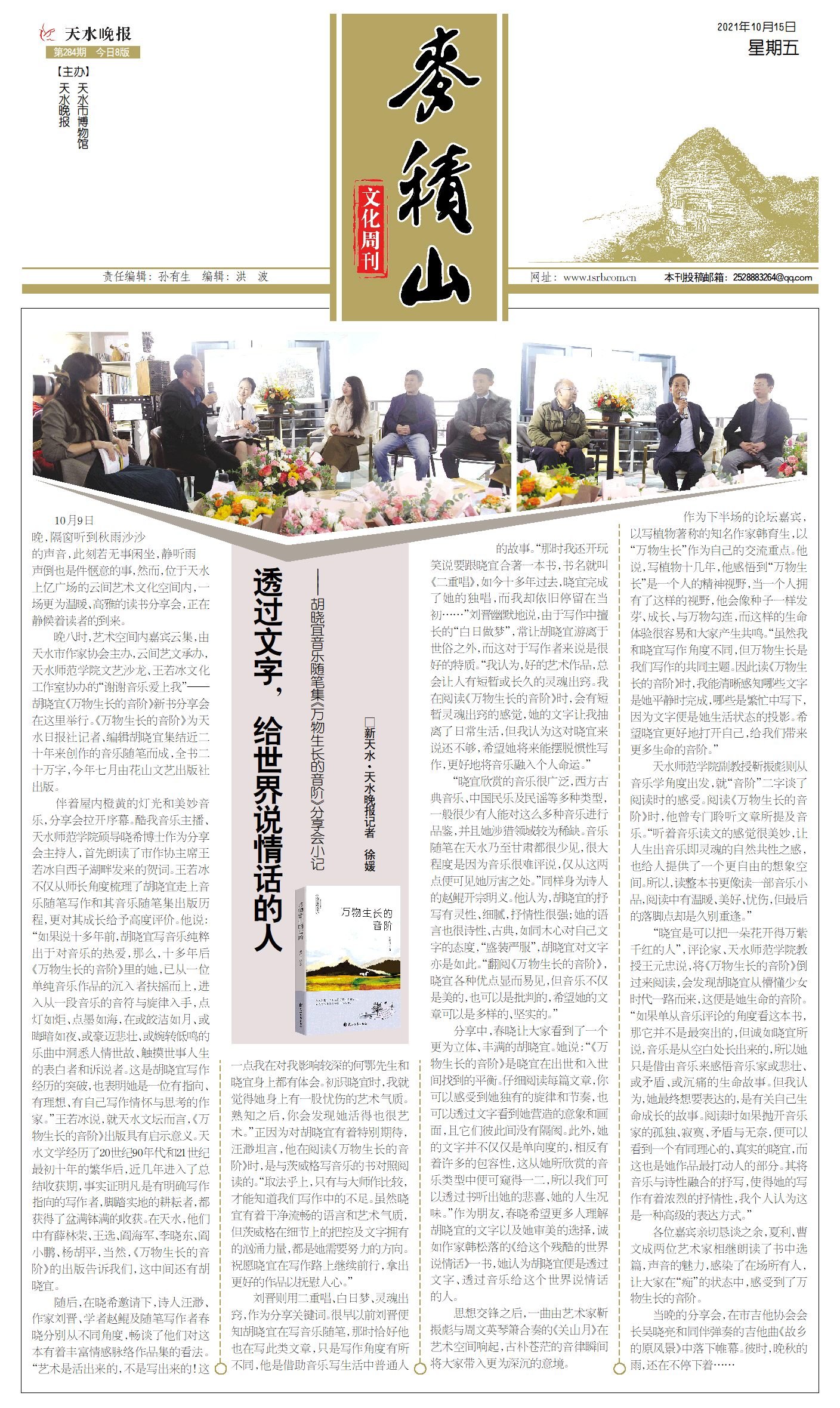 晚八时,艺术空间内嘉宾云集,由天水市作家协会主办,云间艺文承办,天水师范学院文艺沙龙、王若冰文化工作室协办的“谢谢音乐爱上我”——胡晓宜《万物生长的音阶》新书分享会在这里举行。《万物生长的音阶》为天水日报社记者、编辑胡晓宜集结近二十年来创作的音乐随笔而成,全书二十万字,今年七月由花山文艺出版社出版。