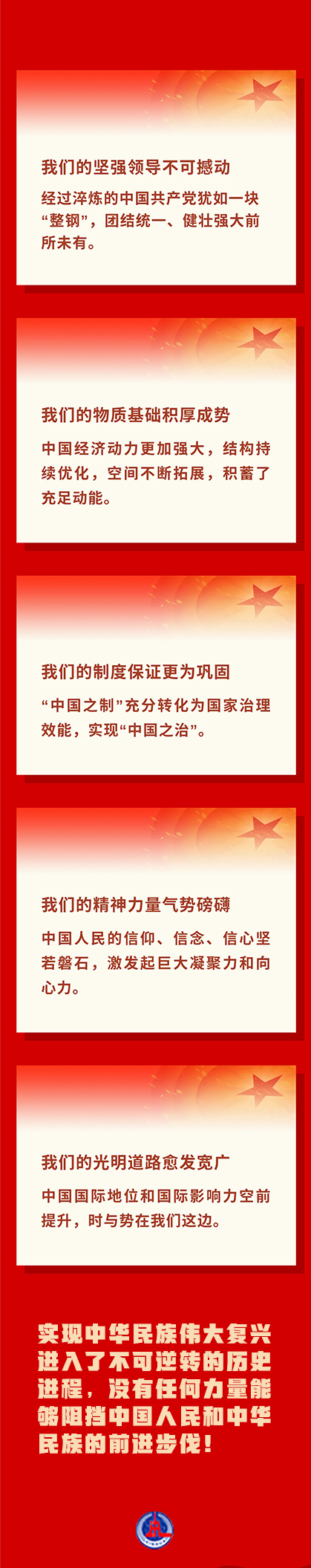 新征程上,习近平总书记的宣示愈发坚定而豪迈:“有中国共产党的坚强领导,有全国各族人民的紧密团结,全面建成社会主义现代化强国的目标一定能够实现,中华民族伟大复兴的中国梦一定能够实现!”