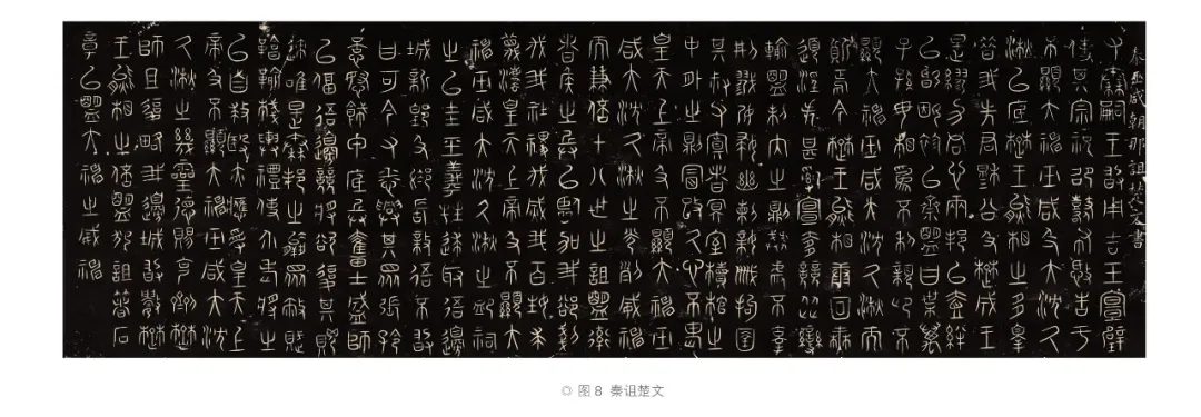 王国维在《史籀篇疏证序》中说:“秦用籀文,六国用古文”。籀文与小篆乃渐进式发展,并无明显分期,秦公簋铭文,石鼓文本一脉相承,在字形字体上虽颇有小异,然无大别,可以说,是直接影响了小篆的典型文字。秦统一后,能够在全国很快实现“书同文”,是这种典型文字一直强化、影响的结果。它们在书法上,尤其是石鼓文对后世书法的影响,又是需要大书特书的事,在此暂不赘述。