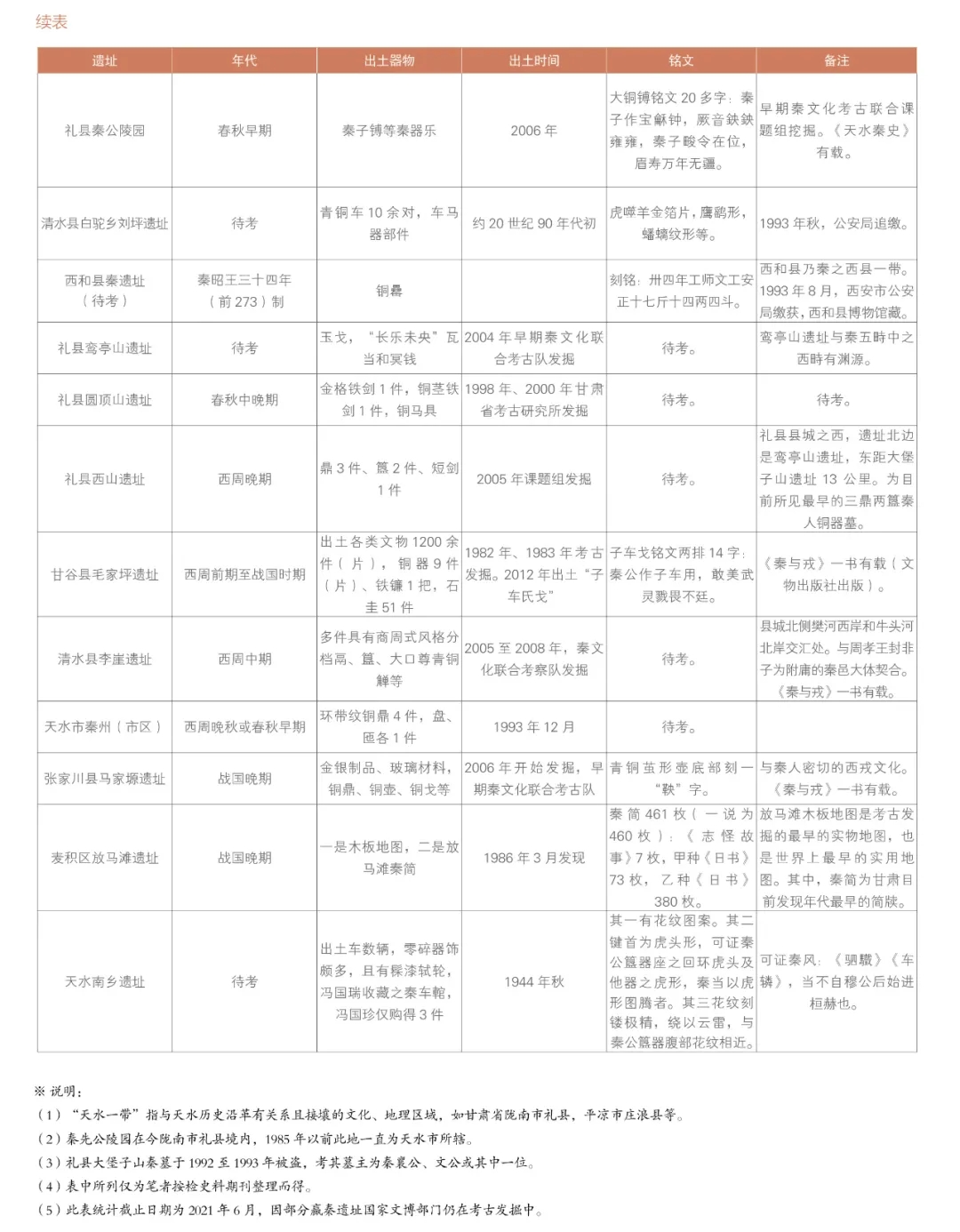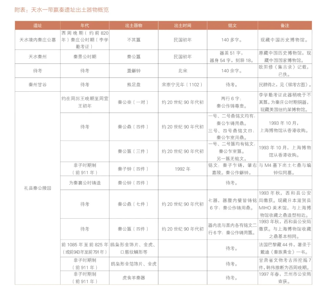 笔者今搜寻诸家所载,而不限于铜器,制成一表,为《天水一带嬴秦遗址出土器物概览》(见附表),冀有益于对秦公簋及其他器物的比照研究,亦可证秦公簋确为非孤立之文化现象。