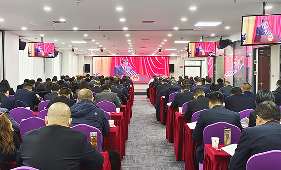 (出席区政协九届一次会议的全体委员在分会场收听收看会议)