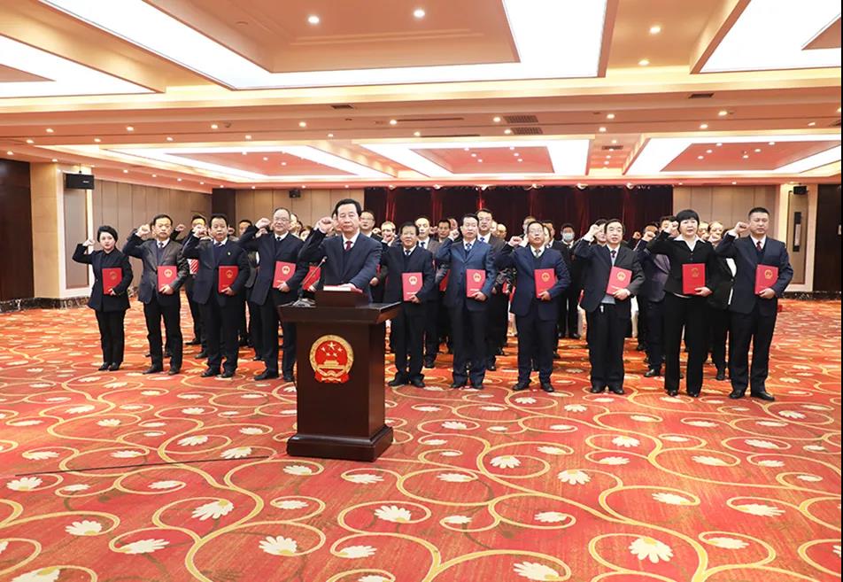 新当选的区人民政府区长孟晓龙左手抚按《中华人民共和国宪法》,右手举拳,面对国徽、国旗,带领新当选的区人大常委会主任魏胜奎,区监察委员会主任李亮、区人大常委会副主任罗荣昌、伏承祥、师振纲、刘书文、王欢、刘晓军,区人民政府副区长张维有、马小军、景怡、惠斌、薛小海等向宪法宣誓:“我宣誓:忠于中华人民共和国宪法,维护宪法权威,履行法定职责,忠于祖国、忠于人民,恪尽职守、廉洁奉公,接受人民监督,为建设富强、民主、文明、和谐的社会主义国家努力奋斗!”