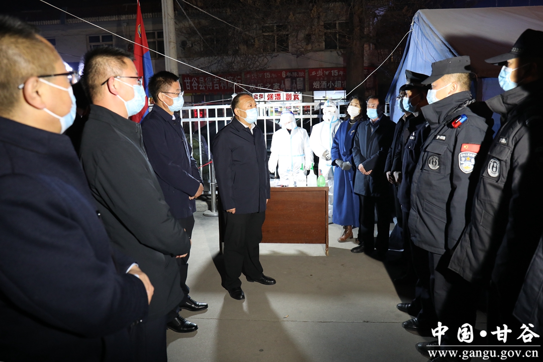 新天水讯 据甘谷县融媒体中心消息 12月29日晚,甘谷县委书记吴健,县委副书记、县长孙忠平督查疫情防控工作,看望慰问坚守岗位的一线值守人员,强调要强化底线思维和忧患意识,保持高度警惕,以严而又严、细而又细、实而又实的作风,全力以赴外防输入,集中精力守好防线,保障人民群众生命安全和身体健康。县委常委、政法委书记杜兴,副县长张涛、刘强、金辉一同督查。