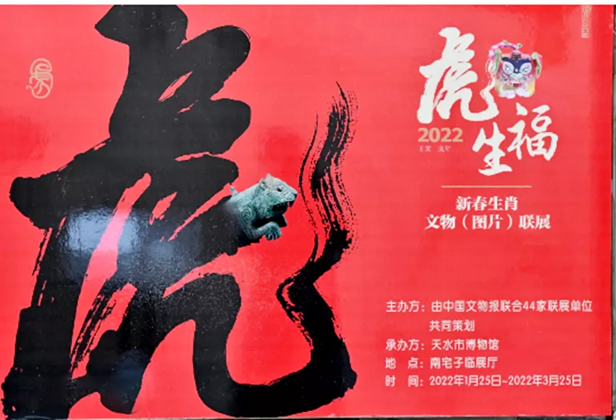 新天水讯【记者刘蕾】为了喜迎新春,弘扬中华民族优秀传统文化,1月25日上午,由国家文物局指导,北京自然博物馆、山西博物院、河南博物院、辽宁省博物馆、湖北省博物馆、四川博物院、甘肃省博物馆等44家文博机构,共同策划的壬寅年“虎虎生福”新春生肖文物图片联展在天水民俗博物馆临展厅开展。