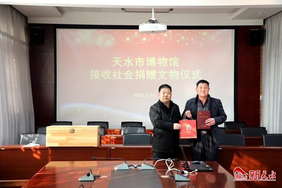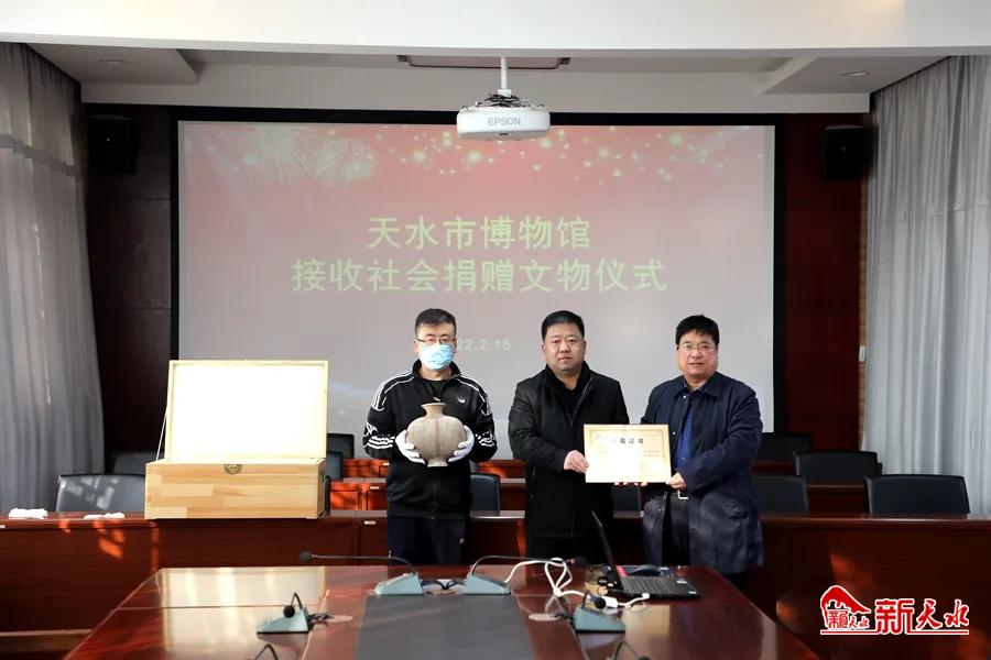 新天水讯【记者刘蕾】我市民间收藏家向市博物馆无偿捐赠4件套藏品,为了表彰我市民间收藏家保护文化遗产的仁心义举,2月15日,天水市博物馆在畅和轩举办了接受社会捐赠文物仪式,并为他们颁发了捐赠证书、赠送了2022年新春吉祥物。