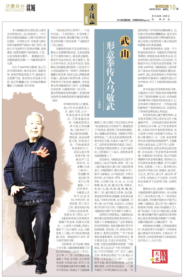谈及练功,马敬武说自己每天早晨都从三体式开始练,按照一顶二扣三圆四敏五抱六直七曲八挺的要领进行,步幅两脚半,臂为半圆(半月),前手与前脚合,右手抱肚脐,手型半阴半阳,站立院中,俨然一棵挺拔的青松。之后练习金、木、水、火、土(也称劈、崩、钻、炮、横)五行拳,再练龙、虎、蛇、马、鹞、鸡、鲐、鼋、燕、鹰、熊、猴十二形,最后练五行连拳、杂式锤、进退连环拳和形意器械。形意拳注重实战,可单形(招)练,也可套路练,可单人练,也可对练,灵活性大,且每次练习时间可长可短,可随意而定,而马敬武则习惯于在早晨和午后练习。