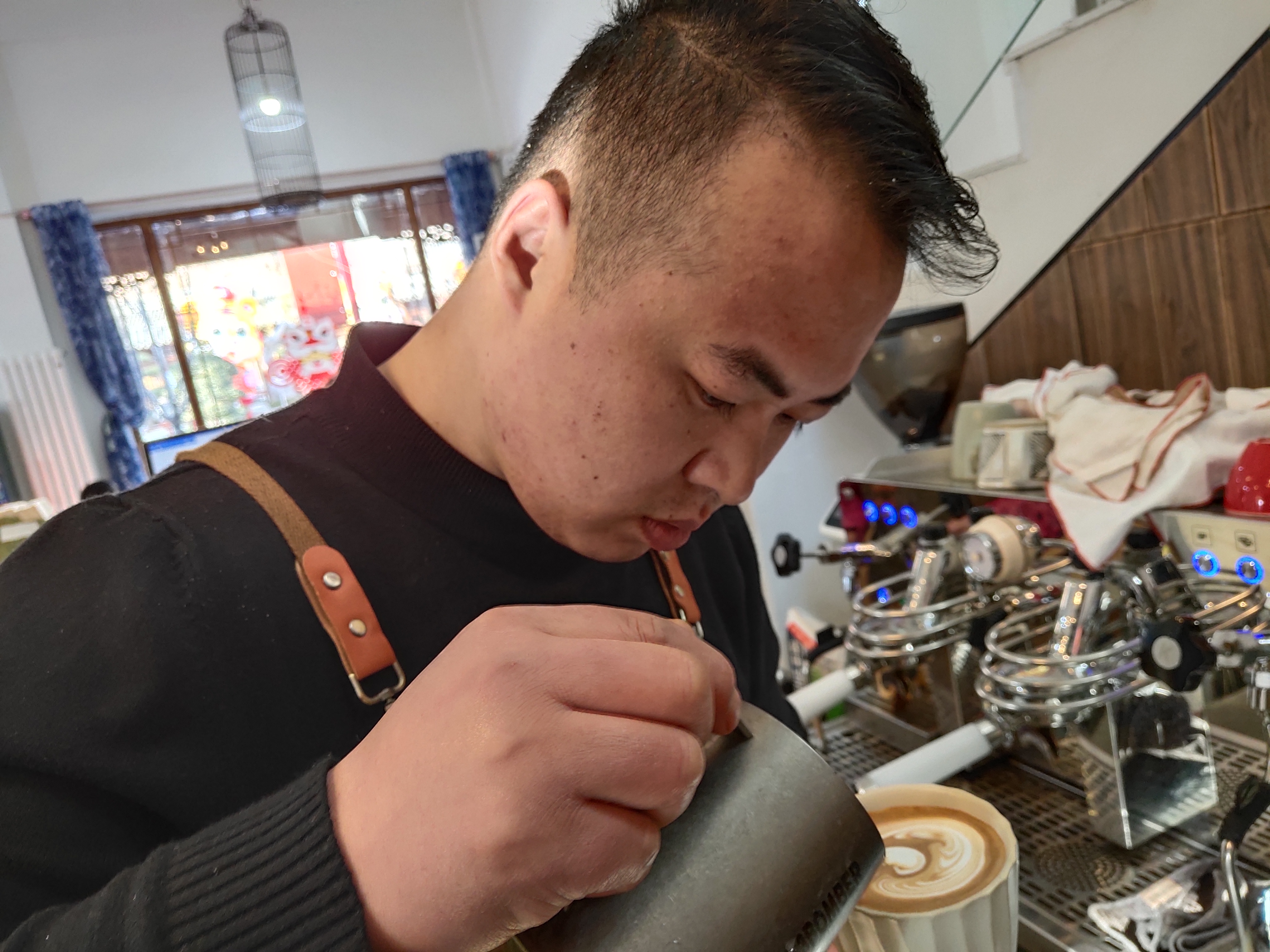 与已“圆梦”的王舜不同,正在追梦的李凯强则是因为被咖啡漂亮的拉花技艺惊艳,而与咖啡结缘。于是他走进西餐厅后厨,跟师傅学起了做咖啡。“毫无疑问,第一次做咖啡我就失败了。但更‘过分’的是,师傅竟还让我把那杯咖啡一口气喝完。”回忆起刚学做咖啡时的糗事,李凯强笑着说,“那种感觉就像喝醉了一样。做拉花的基本功就是水流,为了尽快熟悉咖啡拉花制作工艺,我花了一周的时间,哪怕是走在路上,脑子里都在不断反复练习咖啡的拉花流程。”此外,他还通过与师傅讨教,利用快手等软件一遍遍练习、尝试。每天沉浸在如何制作出漂亮的咖啡拉花思考中的李凯强,还特意参加了专业比赛,并认识了拿到全国总冠军的天水同行。