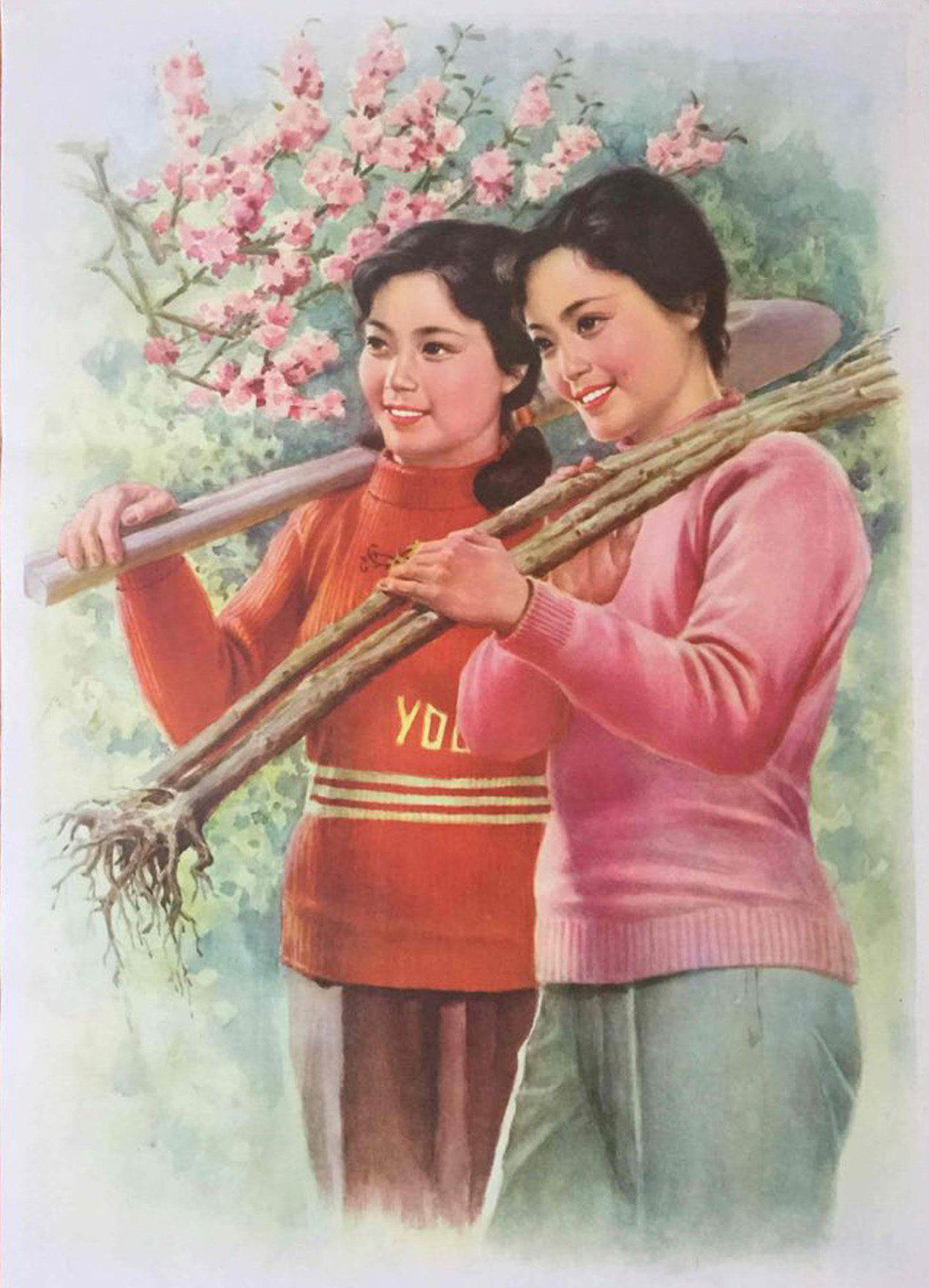 绿化祖国多植树宣传画,这幅宣传画是藏友送给我的。该画的作者为邬华敏,由四川人民出版社1983年出版。画面中,两名风华正茂的女青年并肩站立,右边扛树苗的女青年身着粉红色毛衣,灰色长裤。她身材苗条,面目清秀,微侧着脸庞,脸上的笑容比身后的桃花还美。左边身穿橘红色针织衫、梳着小辫的女青年,肩扛铁锹,目视前方,仿佛正在和身边的女友说着什么趣事。这幅宣传画色泽艳丽流畅,人物栩栩如生。其“绿化祖国多植树”的主题至今仍不过时,观之能激发人们植树造林的热情,是不可多得的一件藏品。