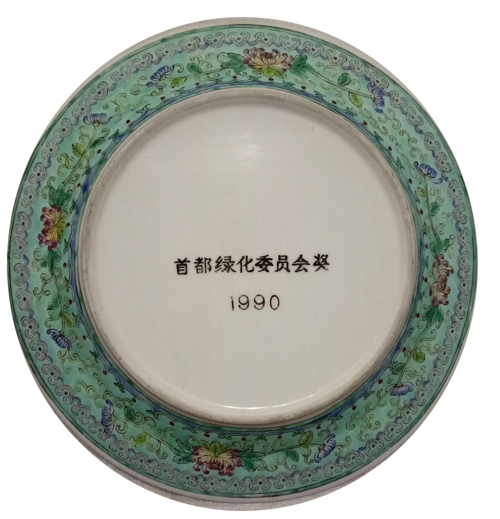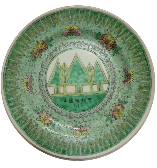 植树节彩绘大瓷盘,表姐是北京的一名园艺师,她知识广博,经验丰富,这只彩绘大瓷盘是她的奖品。我搬新家时,表姐将大瓷盘送给了我。瓷盘绿意盎然,直径26厘米,盘中心圆圈内的白底上绘着5棵大树,寓意“森林”,树下有“中国植树节”“3.12”的字样,表明这只瓷盘是为纪念植树节而作。圆圈外,淡绿色的底子上由内向外有三层纹饰,最里面一层是如意纹,中间满绘缠枝纹,上面点缀着菊花和彩蝶,最外面那层是浅绿和深绿错落排列的树木。盘子外壁的绿底上绘有如意纹、菊花纹和缠枝纹,盘底中间的白底上写有“首都绿化委员会奖”“1990”字样,表明了这只瓷盘的用途和制作时间。该瓷盘色彩艳丽,设计精巧,器型规整,花纹繁而不乱。闲暇时观赏此大瓷盘,好似看到一个朝气蓬勃、郁郁葱葱的春天。