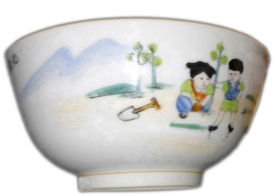 植树粉彩小碗,这只粉彩小碗是我10年前在当地的古玩市场淘到的,当时一看到碗上简洁生动的植树图案就喜欢上了。它直径11厘米,高5.5厘米,制作于二十世纪六七十年代。碗的正面有图案,画面中,青山如黛,树木葱茏,春光灿烂。一男一女两名少年正在认真地植树。女孩蹲在地上培土,男孩站在旁边扶树苗。在他们身边,横放着一把铁锹,图案的左上方写有“绿化”两个字。碗底有标识“中国景德镇”五字,表明这只碗的产地是景德镇。该碗小巧精致,釉质光洁细腻,画面色彩搭配和谐一致,清新自然,展现了时代精神风貌,极具收藏价值。