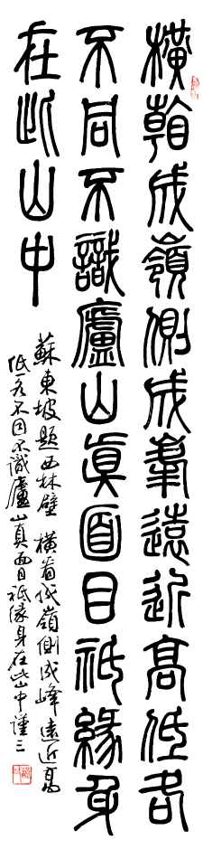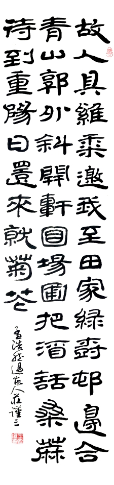 说明了来意,打开魏老遗作,王老按捺不住喜悦的心情对我说,魏老的字已装在他的大脑里,此幅未钤印隶书条幅确为其作品,只是让他题跋有点不太合适。当我再次说明缘由后,王老似乎忘记了一天的疲劳,打开灯,神情贯注、不急不缓用小楷题写“周晖同道珍藏魏学文先生未钤印遗作,谨三癸巳深秋识”,虽寥寥二十三字,但用笔利落,优雅超脱,同整幅作品相得益彰,仿若浑然天成。