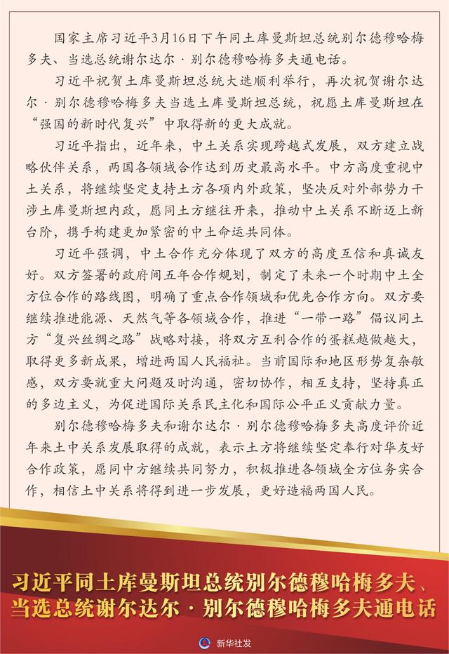 新华社北京3月16日电 国家主席习近平3月16日下午同土库曼斯坦总统别尔德穆哈梅多夫、当选总统谢尔达尔·别尔德穆哈梅多夫通电话。