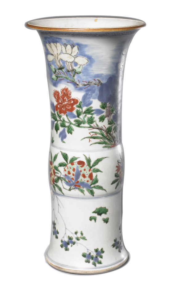 藏于故宫博物院的清顺治“五彩牡丹玉兰纹花觚”,高38.7厘米,口径18厘米,底径12.3厘米。据故宫资料介绍:此觚撇口,直腹,中间略凸,胫部外撇,平底。通体白釉闪青,口沿施酱釉。器身以青花五彩装饰。画面分三层,上部绘月影洞石花卉,牡丹、玉兰等众多花卉簇拥在洞石周围,竞相开放,五彩斑斓。腰部绘两组饱满的石榴纹。胫部绘垂枝海棠。外底涩胎,无款识。顺治五彩瓷器造型基本保留了晚明时期古拙的风格,多以色调对比强烈的红、绿彩描绘粗犷的纹饰。此觚胎体致密,釉面光亮,釉色白中闪青,构图疏朗,以釉下青花来描绘洞石,青花色泽蓝中闪灰。花卉则以釉上黄、绿、红等彩描绘,各色彩料均鲜艳明亮,给人以清晰雅致之美感。