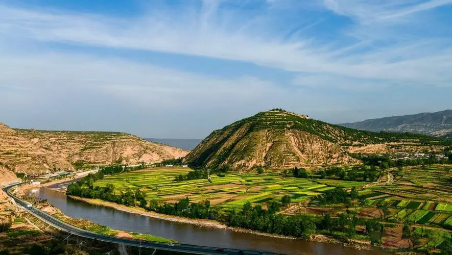 隧道尽头,是三阳川。明胡缵宗《卦台记》云:“朝阳启明,其台光荧;太阳中天,其台宣朗;夕阳返照,其台腾射”。一日之内,三阳殊不同景,故称三阳川。三阳川如一泓椭圆状的平湖,群山环绕,渭水在中间如蛇游弋,将川面切割成两部分。“蛇”的中段有一座孤峰,形似微微隆起的龟背,飘荡在三阳川平静的湖面上。