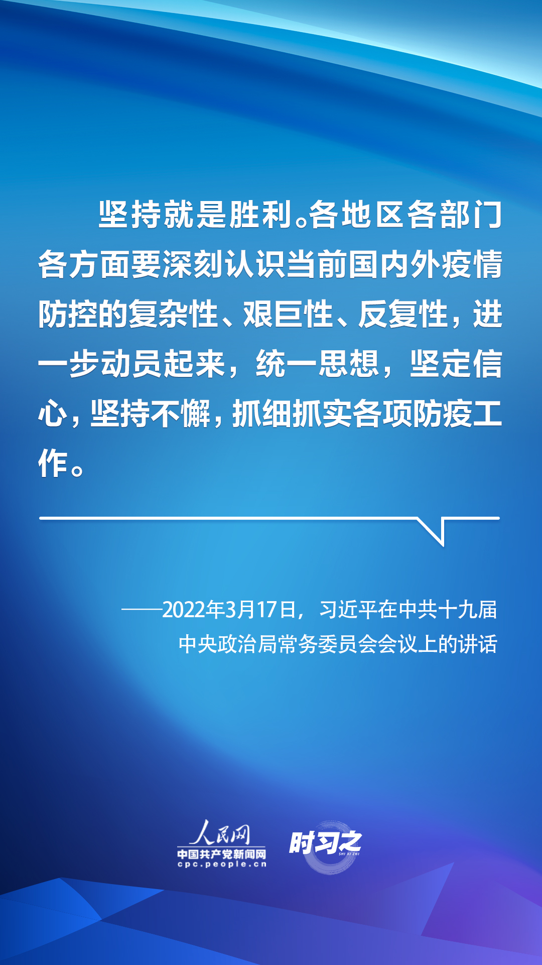 当前,我国防疫抗疫工作依然面临严峻挑战。面对复杂多变的疫情形势,习近平总书记强调,坚持就是胜利。各地区各部门各方面要深刻认识当前国内外疫情防控的复杂性、艰巨性、反复性,进一步动员起来,统一思想,坚定信心,坚持不懈,抓细抓实各项防疫工作。