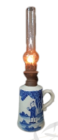 还有一件是青花童子读书煤油灯,制作于民国。由玻璃灯罩、铁皮灯头、瓷灯座三部分组成,通高约37厘米。灯座呈瓷壶状,有一环形把手,把手上有两个突起。灯座正面,以青花绘一幅童子读书图。只见一童子站在地上,头顶发髻,身着长衫,背后挂一帽子,正双手捧书认真阅读。童子的身边摆放着五个花盆,其中一个花盆上栽种的是芭蕉,肥大的叶子郁郁葱葱。转动灯座,白釉上有醒目的青花竖写诗句:“三更灯火五更鸡,正是男儿读书时。”后面有题款:时在“民国”三十六年,大同造。诗句出自唐代颜真卿的《劝学》,看来,童子读书的画面正是根据此诗句的意境绘制的。中间的铁皮灯头锈迹斑斑,上面有“大”字形纹饰和孔洞状花纹,侧边有一个连接小齿轮的旋钮,可调节灯芯控制火光的大小。玻璃灯罩下端鼓鼓的,上端瘦瘦长长,很有特色。这件煤油灯,样式古朴,造型独特,青花色泽青翠,时代特色突出,虽经七十多年时光洗涤,仍保存完好,至今仍可使用。