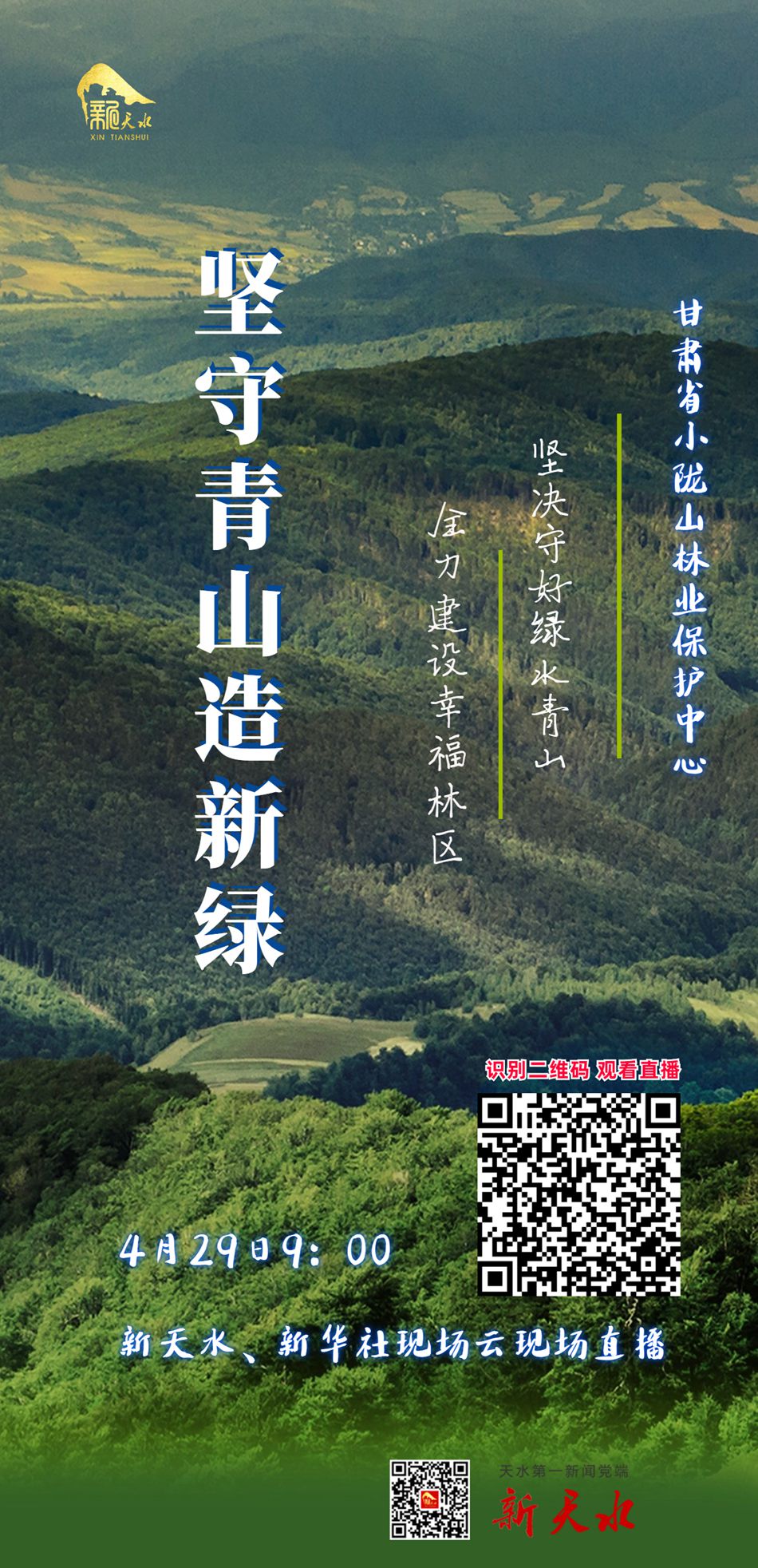 4月29日9:00,新天水直播带你走进甘肃省小陇山林业保护中心植树造林点,一起植“青绿”,见证“一片绿”的诞生。敬请关注!