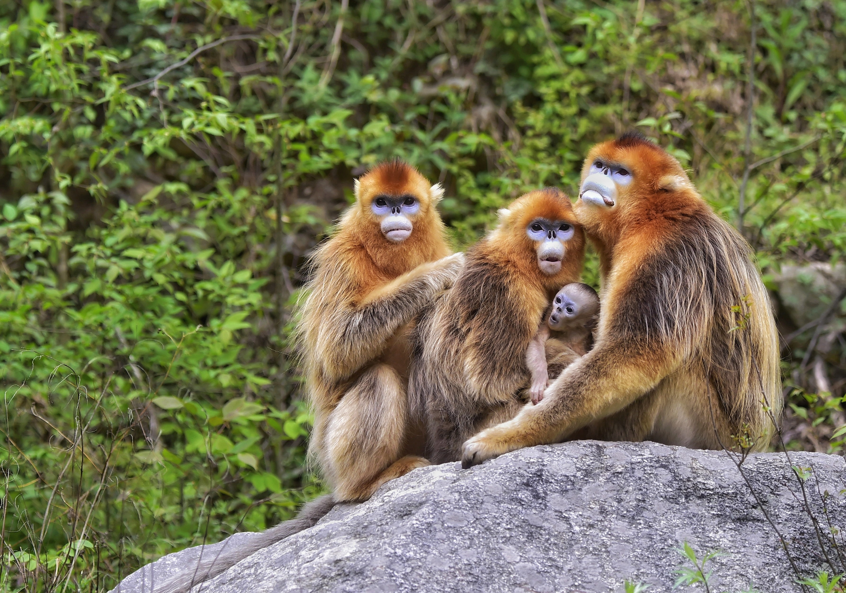 作为与人类同属的灵长类动物,金丝猴同样珍贵。法国博物学家戴维1869年发现了大熊猫,又于次年发现了金丝猴。这个大家族有四支血脉,川金丝猴、滇金丝猴、黔金丝猴、越南金丝猴。前三支生活在云贵川,为中国所特有。秦岭金丝猴属于川金丝猴,它们的英俊洒脱,那是没啥说的。你看,它们身体瘦长,尾巴和身子差不多长,柔软的金色长毛像一件金黄色“披风”,色彩绚丽,细亮如丝。两颊和额正中毛向脸中央伸展,露出两个凹陷的天蓝色眼圈和一个突出的天蓝色吻圈,鼻骨退化得没了鼻梁,鼻孔便向上翘起。因了这副尊容,人们也叫它“蓝面猴”“仰鼻猴”“小鼻天狗猴”。