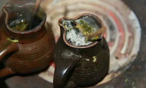 喝罐罐茶的人,大多为农村老人。凌晨早起,劳作回来,他们围坐炉子跟前,添柴烧火,架上茶罐,倒上多半盅山泉,沸腾下茶,用茶多春尖、绿茶,用小棍翻腾搅拌,茶水充分融合,边熬边捣,等茶汁如油汁,就成了酽茶。喝罐罐茶的人,就爱这份酽味。