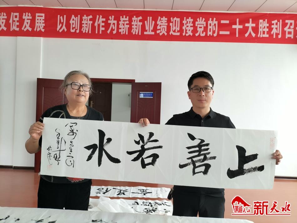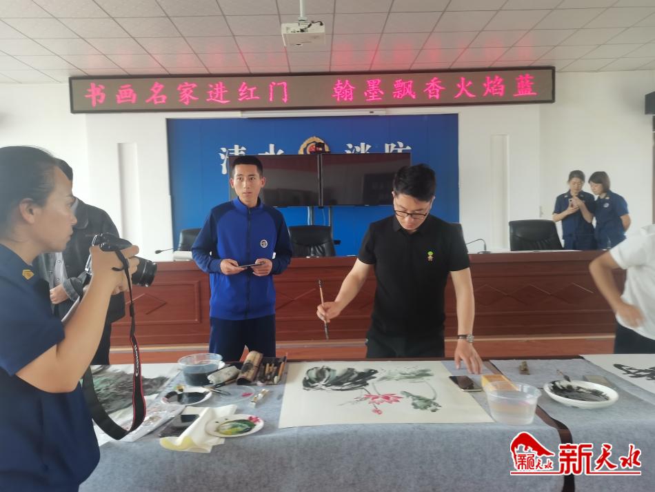 新天水讯【记者刘蕾】为进一步加强消防救援队伍文化建设、丰富广大消防战士的精神文化生活,以创新作为迎接党的二十大胜利召开,5月27日,清水县文化馆联合清水县消防救援大队开展送书画联谊活动。县域知名书画家们在消防大队挥毫泼墨,用一幅幅精美的书法佳作,与消防队员共话消防鱼水情,活跃消防文化生活。