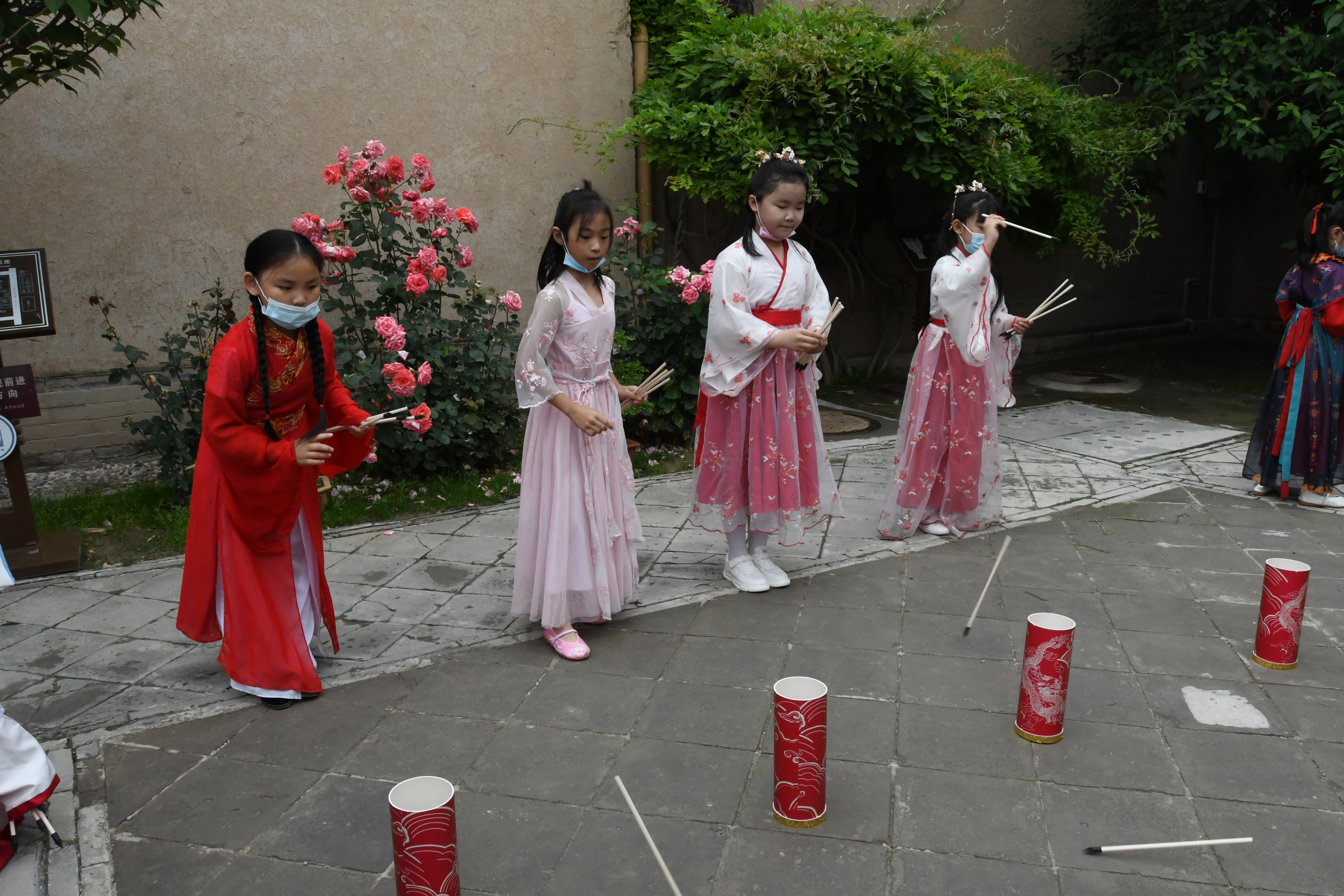活动中,社教专员首先给青少年讲述端午的历史与习俗,接着通过PPT介绍投壶的起源、发展历史,了解投壶的游戏规则。随后,四人一组进行投壶比赛,孩子们身着汉服,宛如回到了古人投壶的场景。每位同学都铆足了劲,生怕落后给对方,大家不停地加油助威。