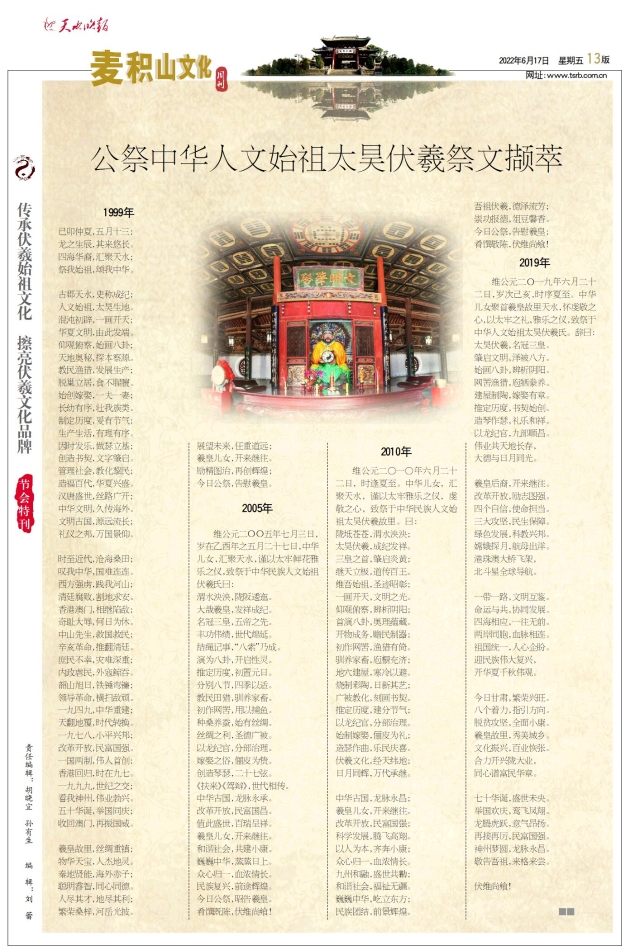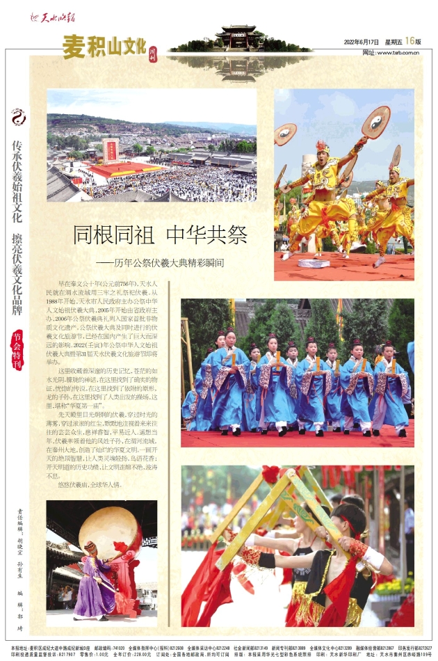 2022(壬寅)年公祭中华人文始祖伏羲大典暨第31届天水伏羲文化旅游节,6月22日将在天水举办,在此,天水晚报麦积山文化周刊特别策划推出“传承伏羲始祖文化 擦亮伏羲文化品牌”节会特刊。