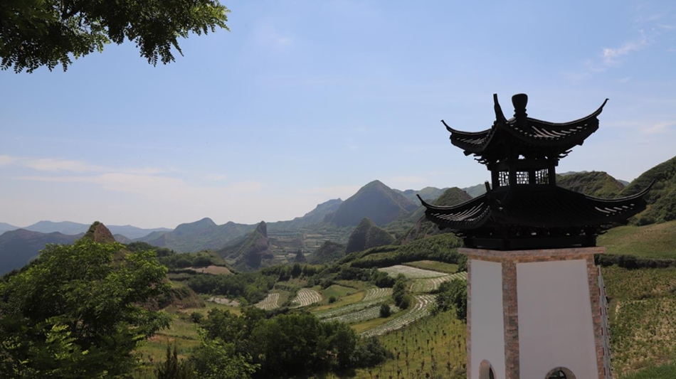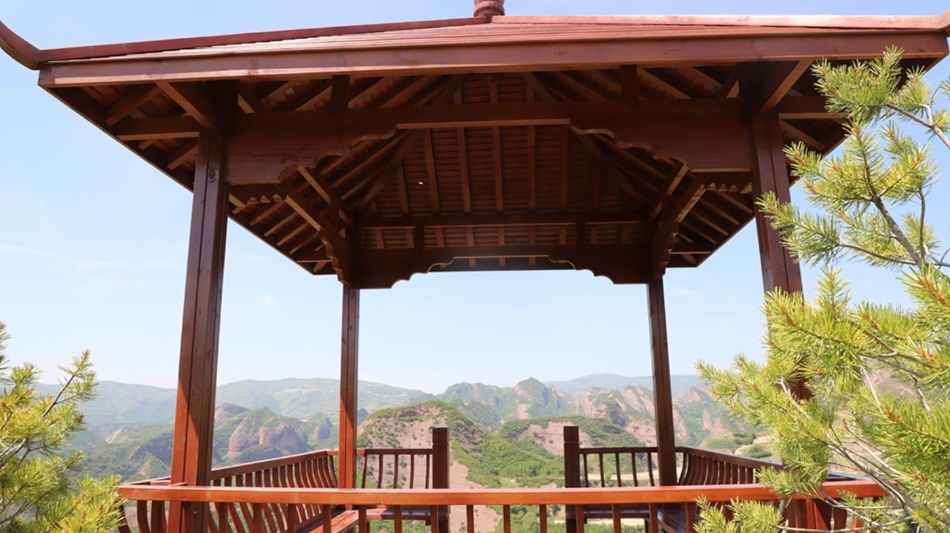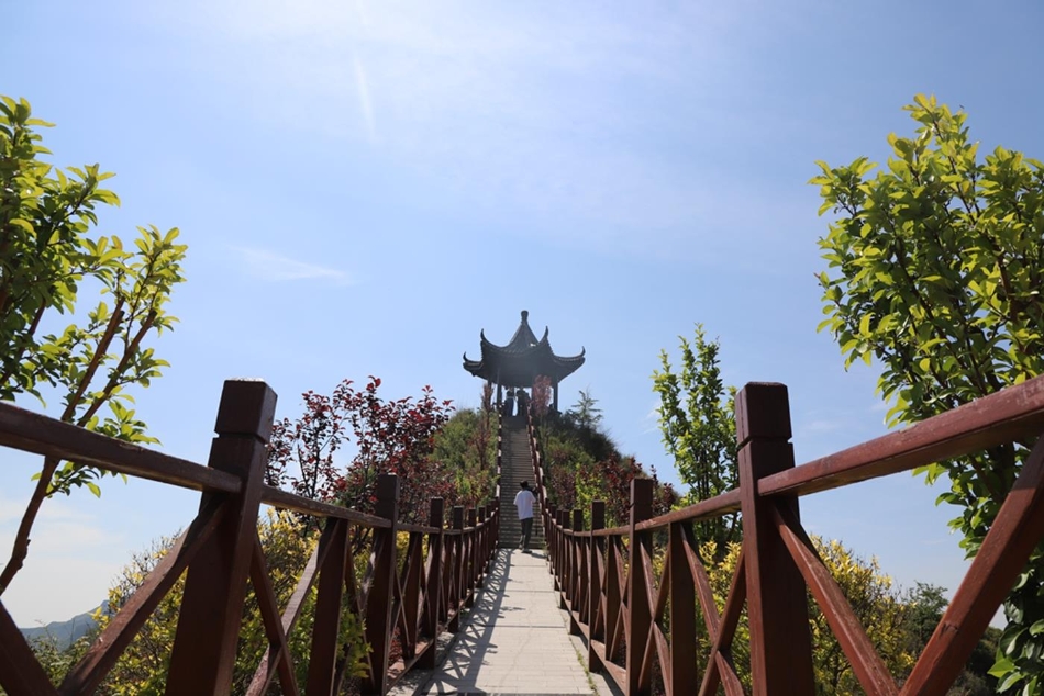 观景台上去是天书洞,要到达天书洞须攀爬挺立八十度的61个石质台阶,走一段距离地面60米的木质栈道,非常险要,因传说洞中藏有天书而得名。在洞内塑有五尊明代的菩萨像,造像具有明显的时代特征。