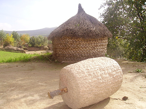 对碌碡的记忆源于儿时,那时碌碡与农人的生活息息相关,农村夏季碾场打麦子,秋季碾胡麻大豆谷子糜子等农作物都要用碌碡。碌碡是一个石制的圆柱体农具,中间略大、两端略小。多用花岗岩、青灰岩或片麻岩凿成,一般长不足一米,直径四五十厘米。木框是碌碡最基本的配套工具,木匠根据碌碡的规格大小,先做好两道横梁、两道边梁、两个圆木销子,再在两边梁上各凿一个长方洞,楔进小木球后榫接而成,在我们陇右农村俗称“剥架”。 记得那时候,夏季麦子收割完上了场,碾压的重担就落到了碌碡身上。碾场时,村人先帮忙摊好麦子,然后,主家站在场中间,一手牵着缰绳,一手拿着鞭子,牛或马、驴、骡等牲口开始拉着碌碡滚动,有节奏地一圈又一圈转着圆圈。碌碡转动的吱吱声,碾压枯干的哗啦声和赶牲口的吆喝声,常常在村庄四周响成一片。