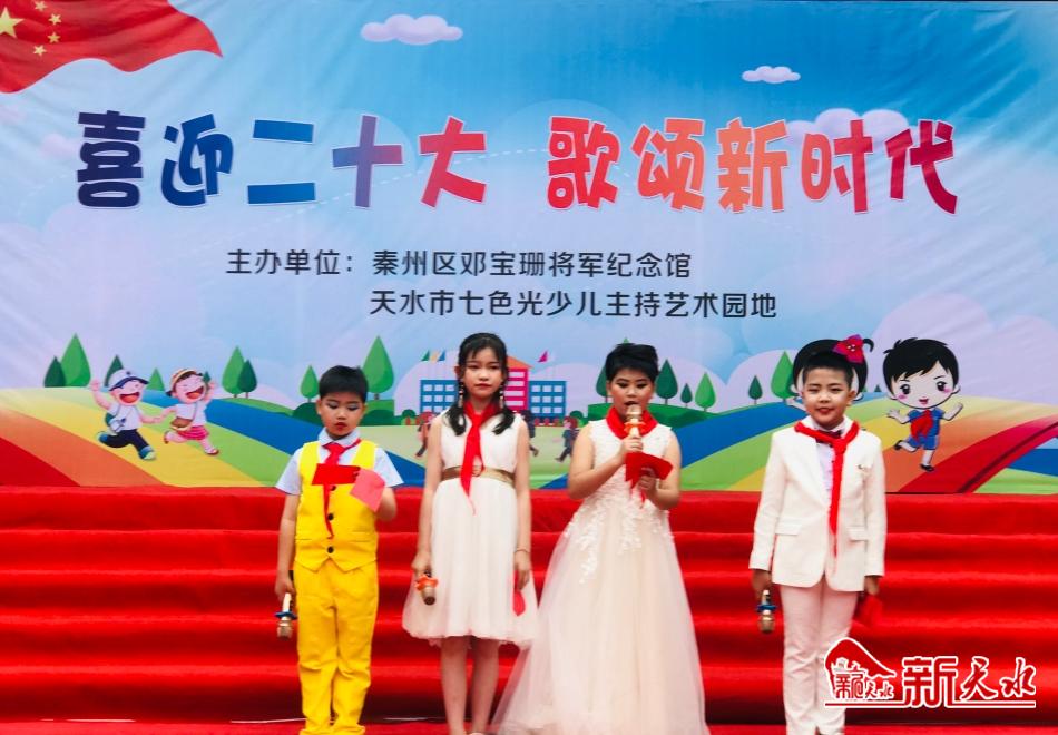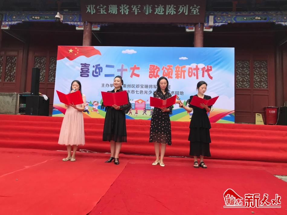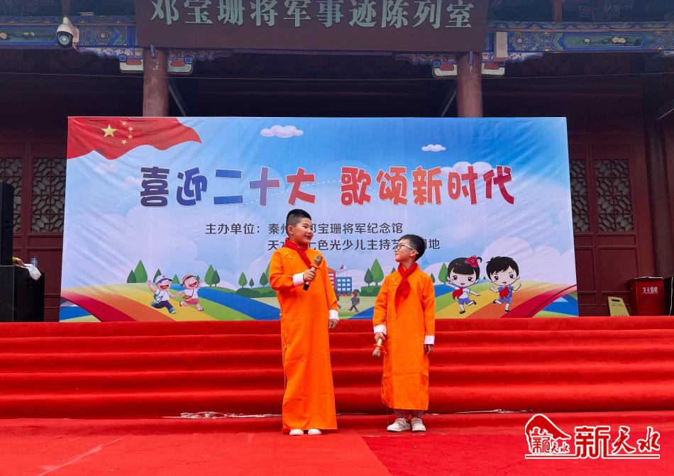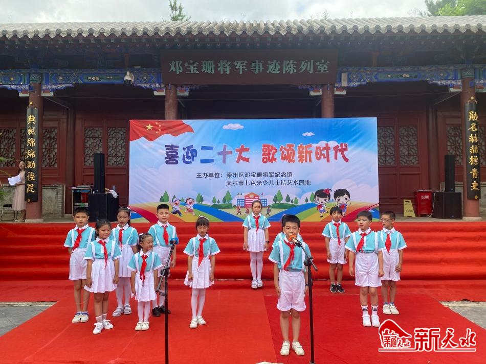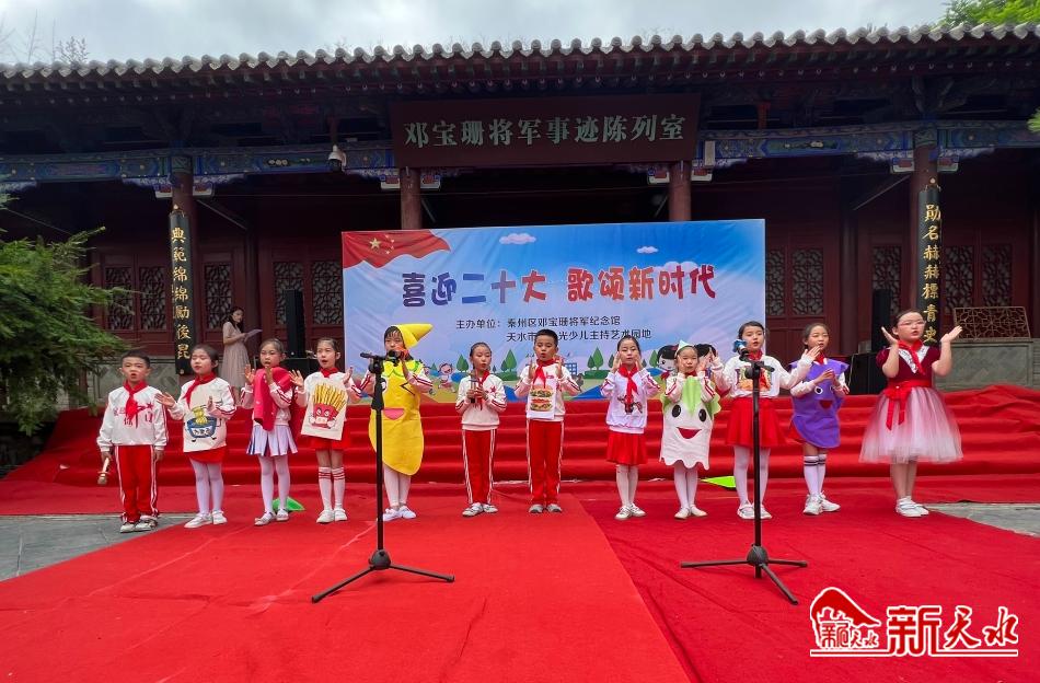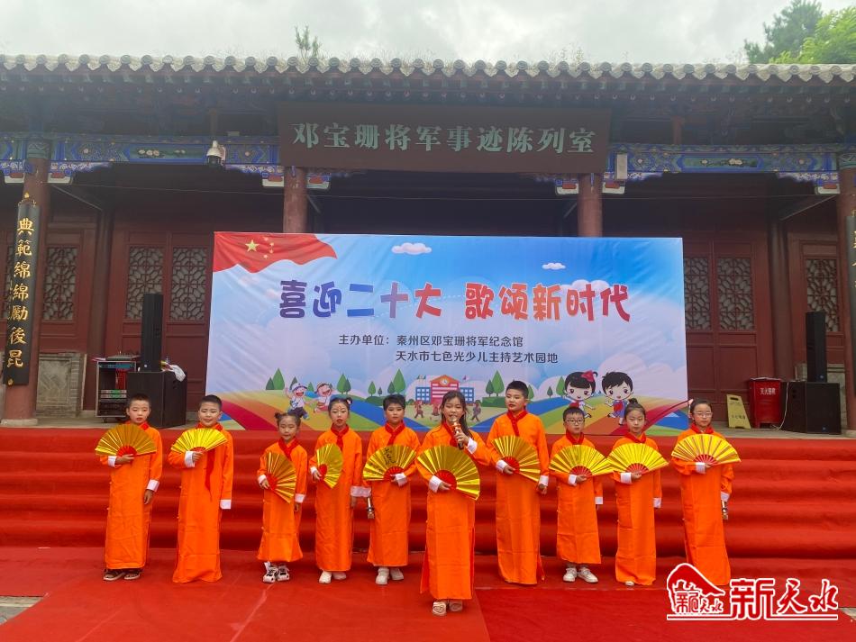 新天水讯【记者刘蕾】为庆祝中国共产党成立101周年,喜迎党的二十大胜利召开,6月25日,沐浴着二十大的喜人春风,披着六月如火的激情,天水市秦州区邓宝珊将军纪念馆和天水市七色光少儿主持艺术园地共同举办以“喜迎二十大,歌颂新时代”为主题的庆“七一”经典诵读活动。