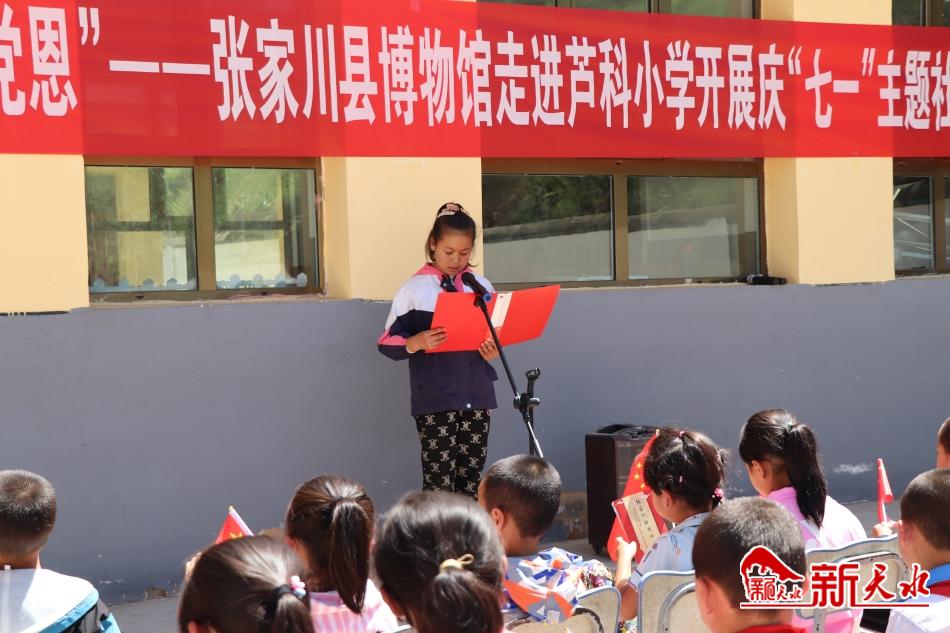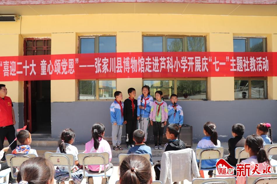 新天水讯 为庆祝建党101周年,进一步宣传党的光辉历程和丰功伟绩,加强青少年爱国主义情怀,珍惜来之不易的幸福生活,在“七一”建党节来临之际,6月30日,张家川县博物馆走进刘堡镇芦科小学举办了以“喜迎二十大,童心颂党恩”为主题的诗歌朗诵社教活动,为全校55名师生带去了一场文化盛宴。