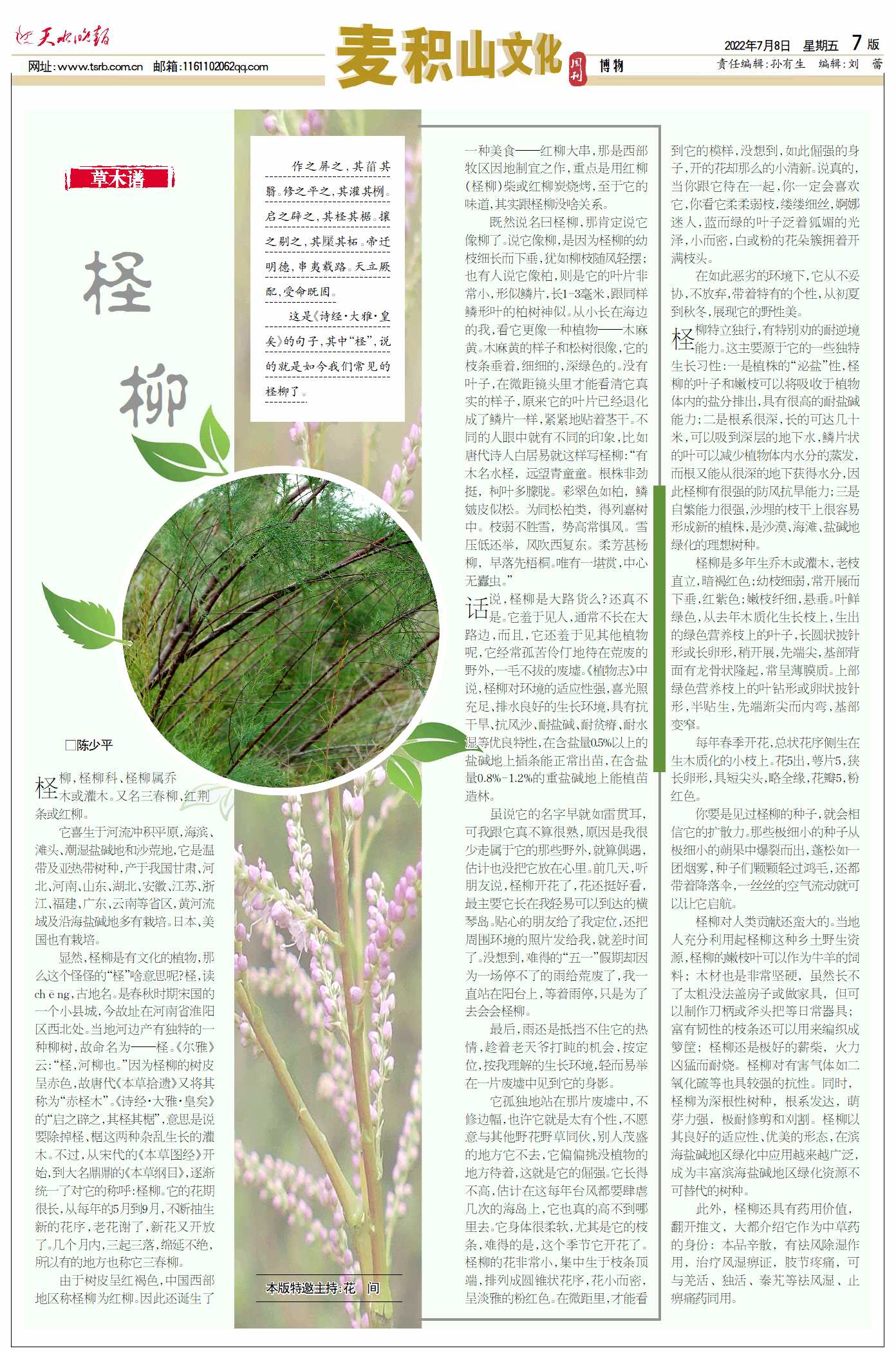显然,柽柳是有文化的植物,那么这个怪怪的“柽”啥意思呢?柽,读chēng,古地名。是春秋时期宋国的一个小县城,今故址在河南省淮阳区西北处。当地河边产有独特的一种柳树,故命名为——柽。《尔雅》云:“柽,河柳也。”因为柽柳的树皮呈赤色,故唐代《本草拾遗》又将其称为“赤柽木”。《诗经·大雅·皇矣》的“启之辟之,其柽其椐”,意思是说要除掉柽、椐这两种杂乱生长的灌木。不过,从宋代的《本草图经》开始,到大名鼎鼎的《本草纲目》,逐渐统一了对它的称呼:柽柳。它的花期很长,从每年的5月到9月,不断抽生新的花序,老花谢了,新花又开放了。几个月内,三起三落,绵延不绝,所以有的地方也称它三春柳。
