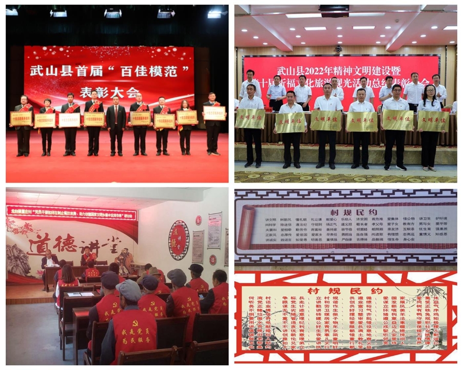 大力培育和践行社会主义核心价值观,举办首届“百佳模范”表彰大会,评选表彰“十佳志愿服务组织”等10类100人(个)。依托人民广场,倾力打造以“德润武山”“社会主义核心价值观”“中华传统文化”和“武山十有”为主题的新时代文明实践广场,让文明实践处处可见,人人可为。不断健全完善县、乡、村三级评选机制,各乡镇新时代文明实践所(站)评选表彰各类先进典型1500多名,开展学习宣传活动200多场(次),成功创建市级“文明单位”“文明乡镇”“文明村”和“文明校园”15个。同时,积极开展创建和命名表彰第十八批县级文明单位、文明村、文明社区和第四届文明校园78个,在全县营造见贤思齐的浓厚氛围。褒扬向上向善、孝老爱亲等先进典型,打击失信失德、封建迷信等不良习俗,依托文明实践建立完善村民议事会、红白理事会,修订完善村规民约、红白理事会章程600多个,签订承诺书1.8万多次,备案登记6000多次,营造了文明和谐的社会环境。