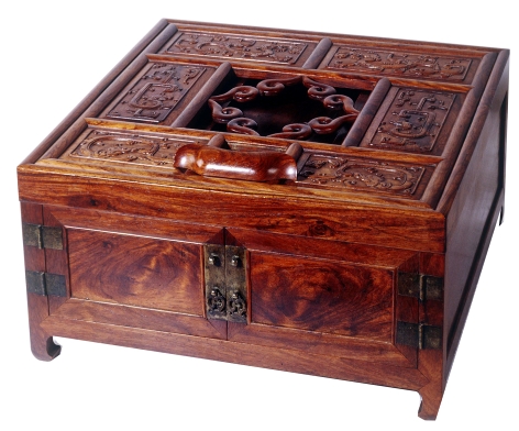 明代黄花梨折叠式镜台,边长49厘米,支起高60厘米,放平高25.5厘米。镜台为折叠式,较为特殊,顶端的盖板可以支撑起大约60度的角度,采用为攒框装板的做法,内分八格,除六格内装板浮雕螭纹以外,正中一格用角牙构成透空的四簇云纹,可以承托铜镜。其下中间一格安荷叶形托子,可以上下移动以便在支架上调节铜镜位置的高低。螭纹装饰板较厚实,中间略厚两边较薄,使得浮雕图案显得鲜明饱满。镜台下部正立面作两开门,门板所用的材料为整个镜台的黄花梨用料中最好的一块,有着行云流水般的自然花纹,构成镜台装饰上的另一道风景。而门内则设抽屉三个,可存放梳妆用具或金银珠饰。镜台下四足架空,作矮扁有力的内翻马蹄造型。通观整件作品,其出处彰显了古朴雅致的风范,意趣非凡。