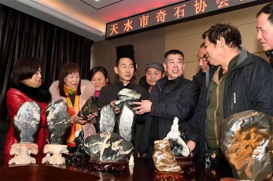 言谈间透着乡音的任文江,虽然是天水市奇石协会会长,但他说自己其实也就是一位普通的奇石爱好者。当记者问起如何挑选一块好石头时,任文江说,一块奇石不但要图案色泽分明,而且要石质密度高。“简单来讲,就像大家夏天挑西瓜,不但要看看纹样,还要敲一敲探探成熟度。挑选石头的过程中,我们也会用别的石头敲打一番听听声音,比如有闷响声的就说明石头品质好,不会轻易破损。而声音发脆的,则不太好。更简单的办法就是掂量一下,通常密度高的石头,也会比一般的石头重。”